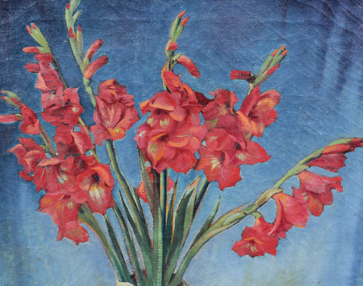DAVIS, Cyril, (English, -1935): Modernist still life of red gladiolas, O/C, 36'' x 28'', signed lower left.
