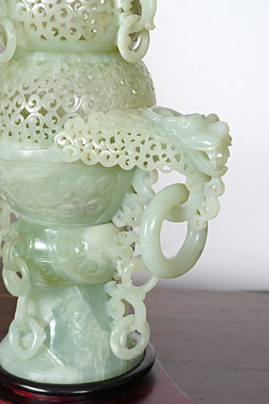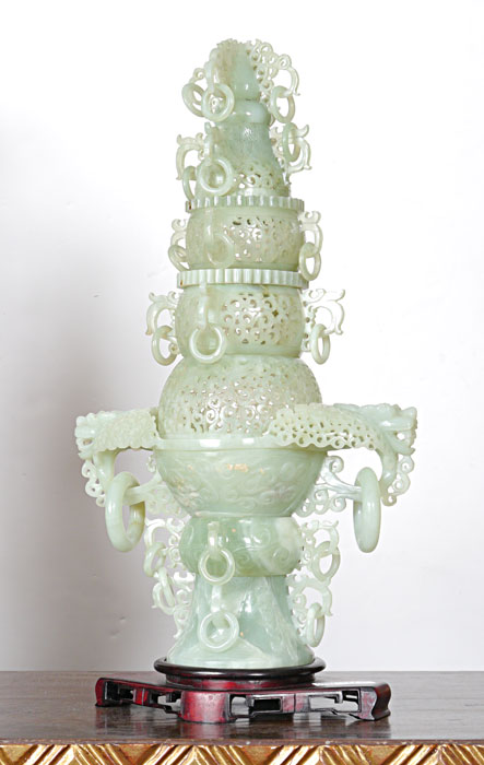 CHINESE CARVED STONE CENSOR: Reticulated and carved, two part censor, measures 19'' tall x 11'' at the widest.