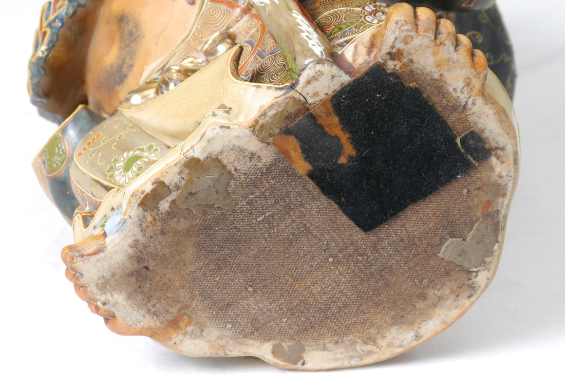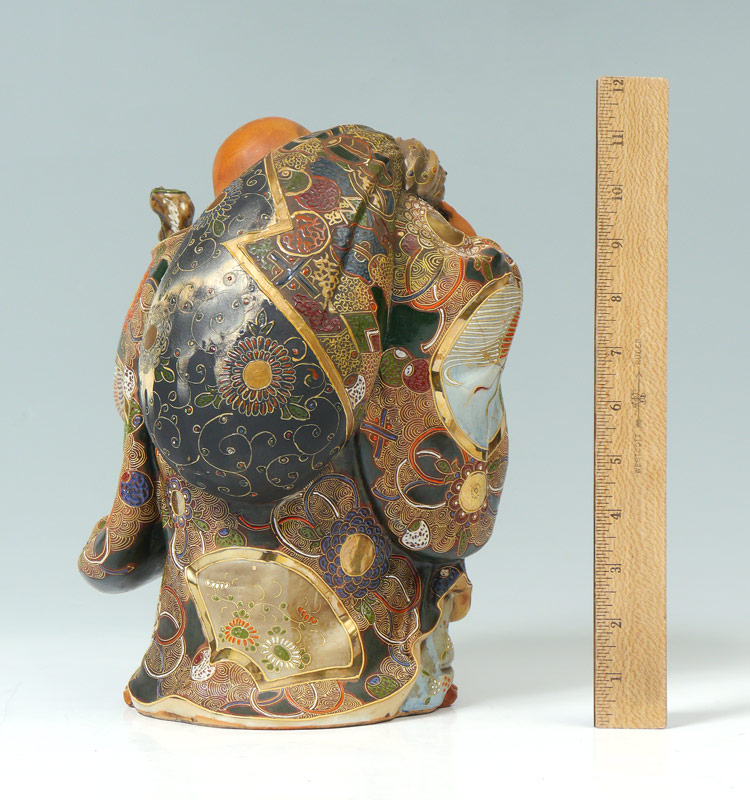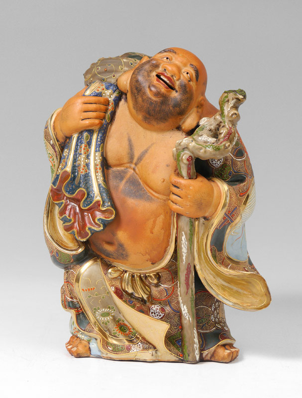 SATSUMA WALKING HAPPY BUDDHA FIGURE: Earthenware figure of happy Buddha holding a staff, bag over other shoulder and robes with satsuma decoration. Unmarked, 11 1/2'' x 9 1/4'' x 7 1/4''.