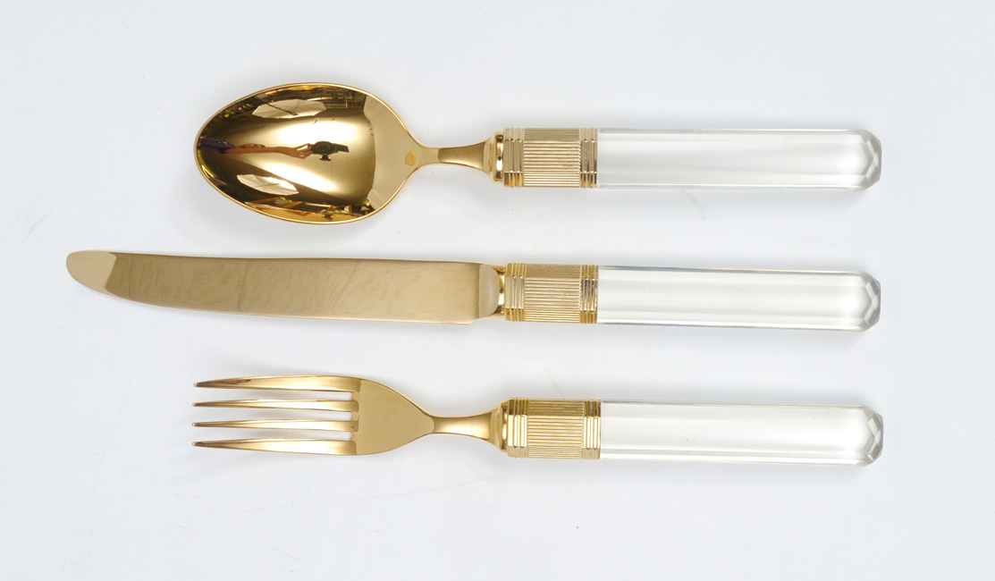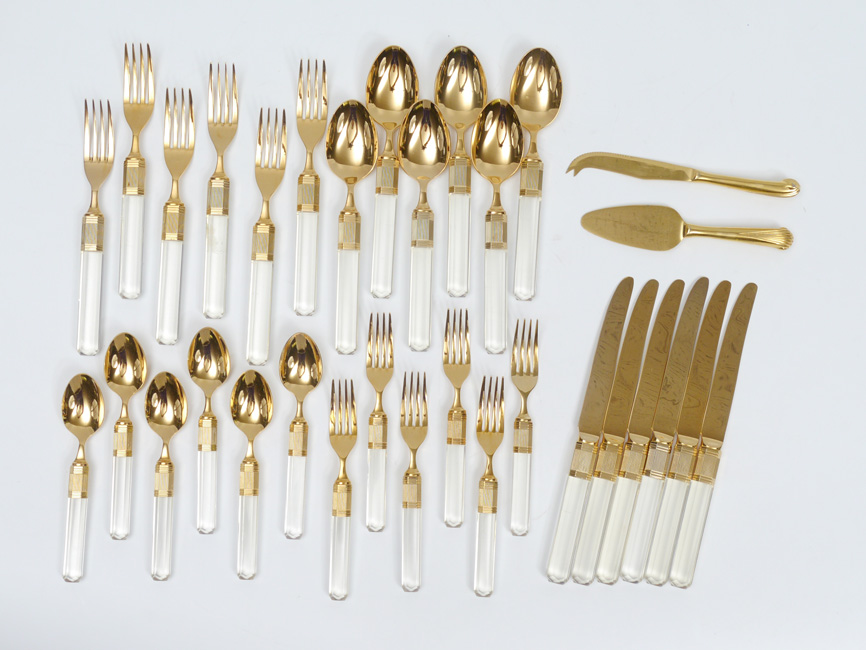 LASKO MIKASA GOLD & LUCITE FLATWARE SERVICE FOR 6: Approx. 30 pieces by Lasko for Mikasa with lucite handles and gold toned stainless steel hardware to include 6 forks (8''), 6 salad forks (6 5/8''), 6 teaspoons (6 1/4''), 6 soup spoons (7 3/4''), 6 knives (9 5/8''). Sold with non matching cheese knife and server.