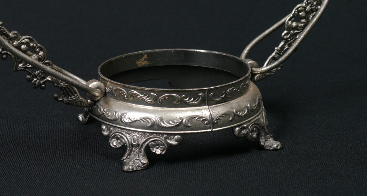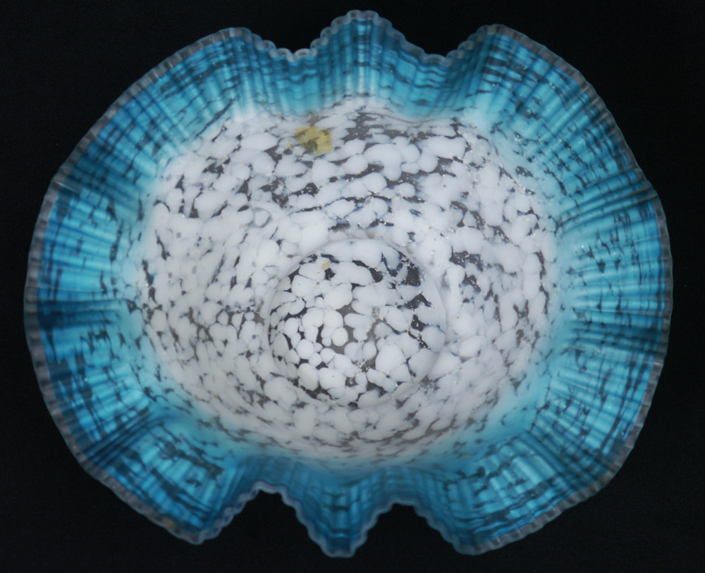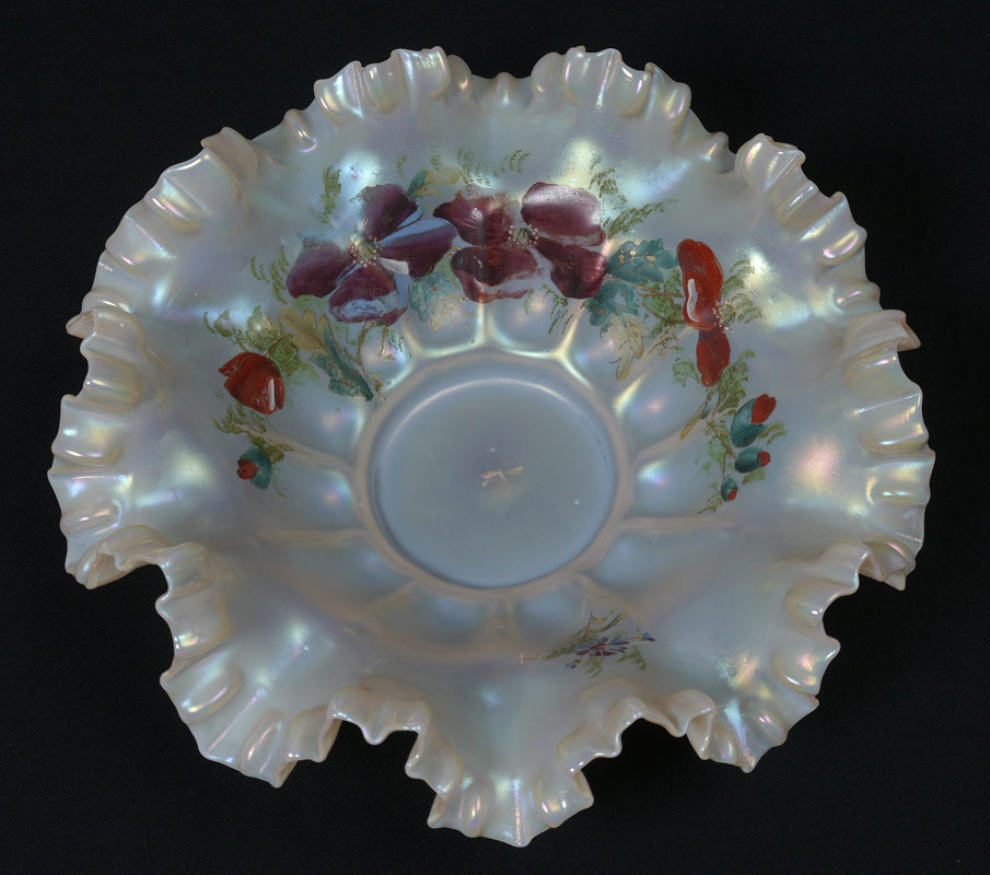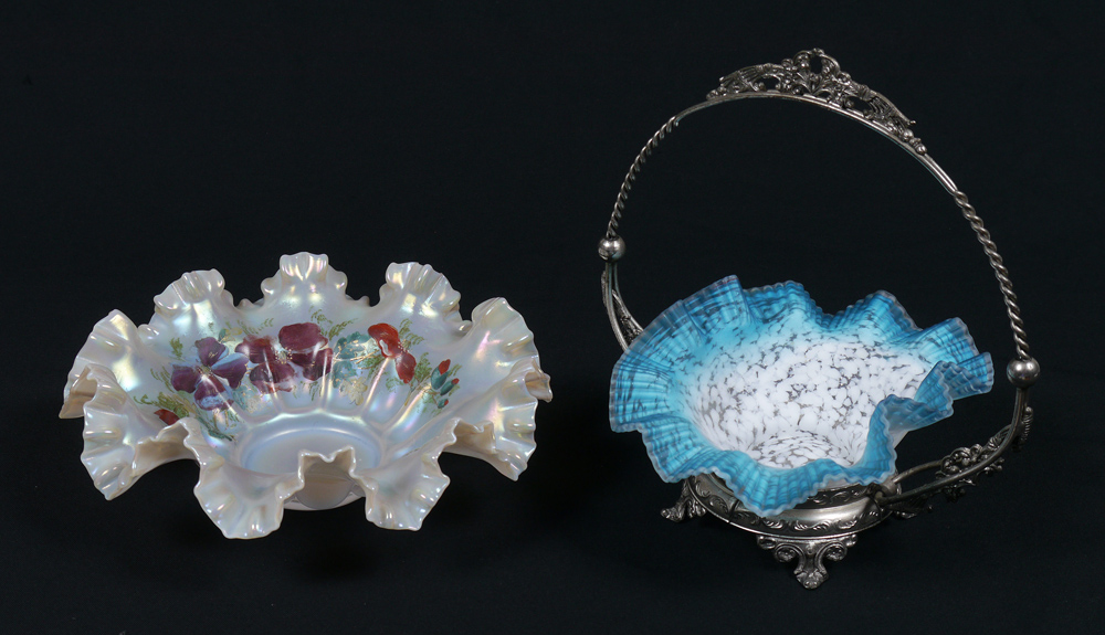 2 VICTORIAN ART GLASS BRIDES BASKETS: 1) Ruffled blue rim, mottled glass 9 1/2'' basket in a silverplated stand, 12''h. x 11 1/2'' wide overall. 2) Hand painted Iridescent glass bowl, 12'' dia.