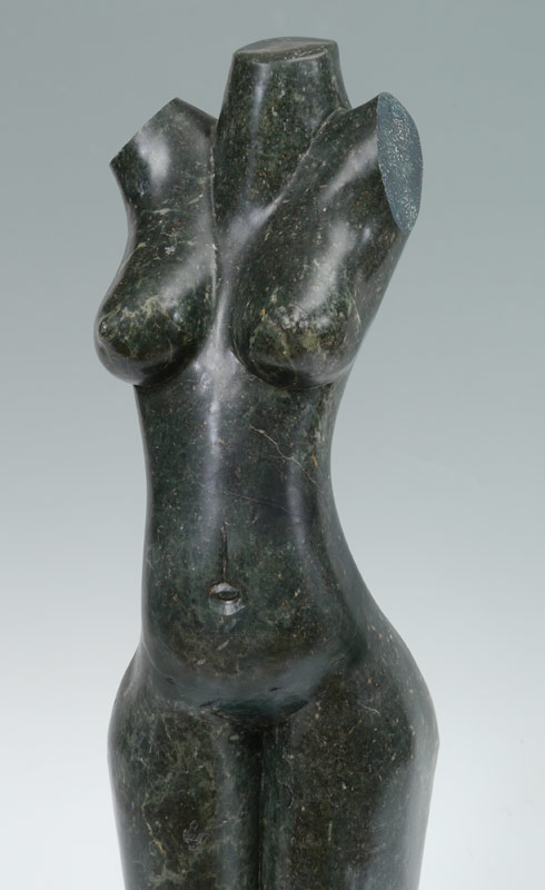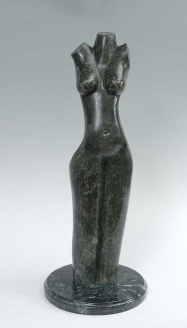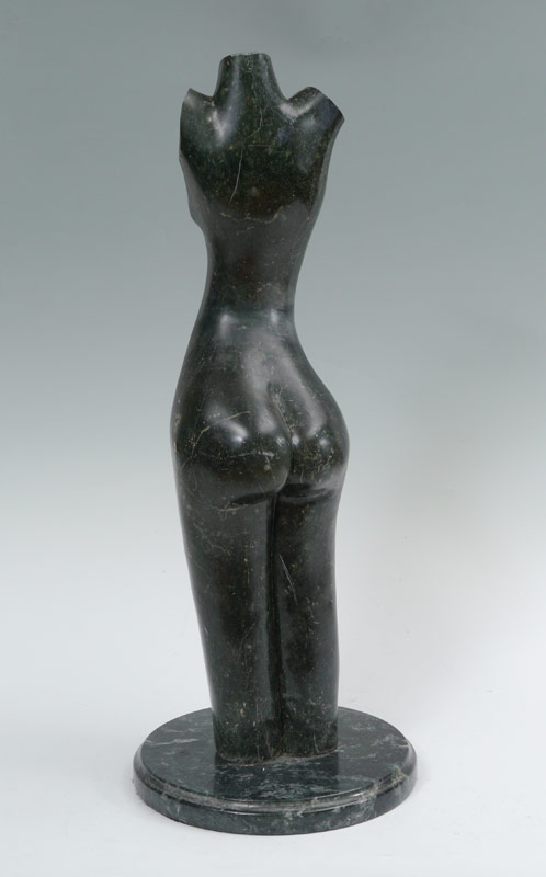 FEMALE NUDE MARBLE SCULPTURE: Armless, Headless, and Footless, 28'' h., affixed to a beveled circular plinth, overall measurement 29 1/2'', no visible signature.