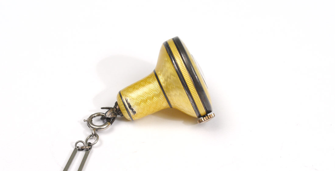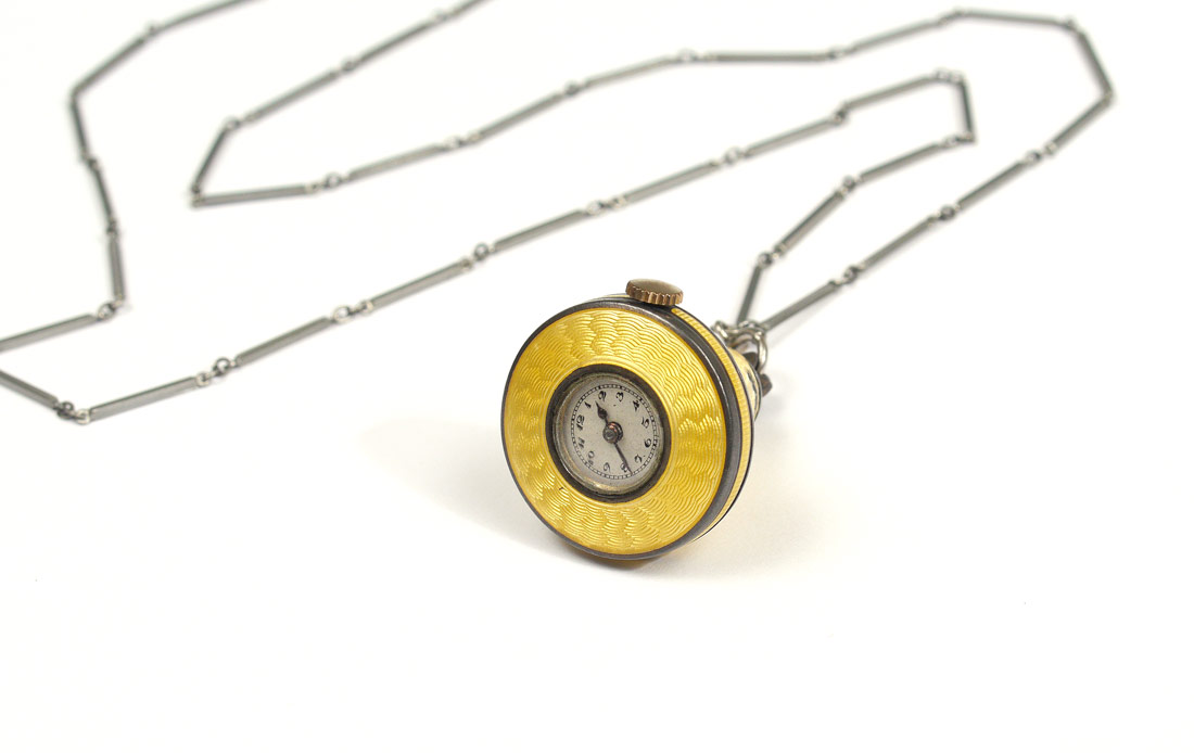 YELLOW GUILLOCHE ENAMEL PENDANT WATCH: Unmarked yellow guilloche case, paper dial with Arabic numerals. Measures 1'' x 7/8'' dia. Sold with chain.