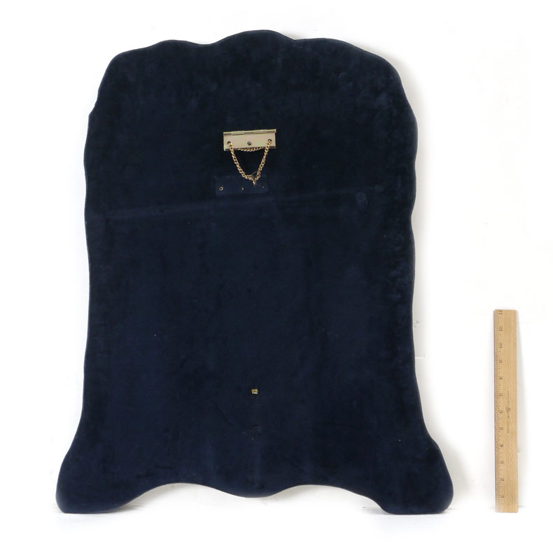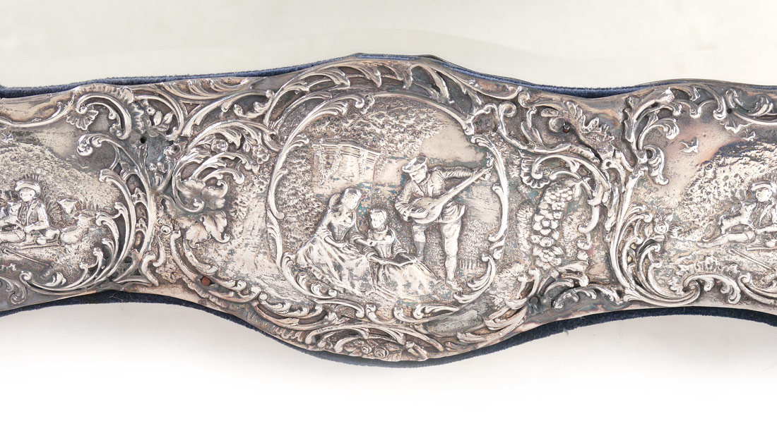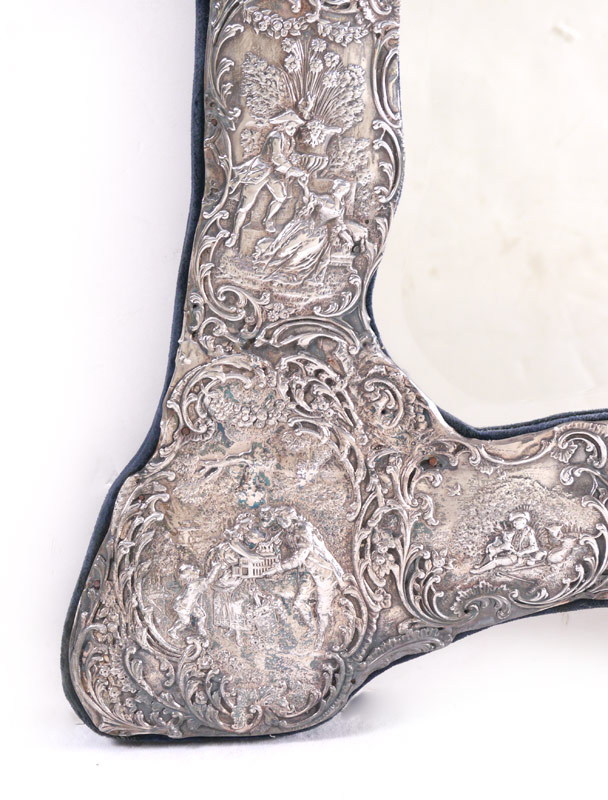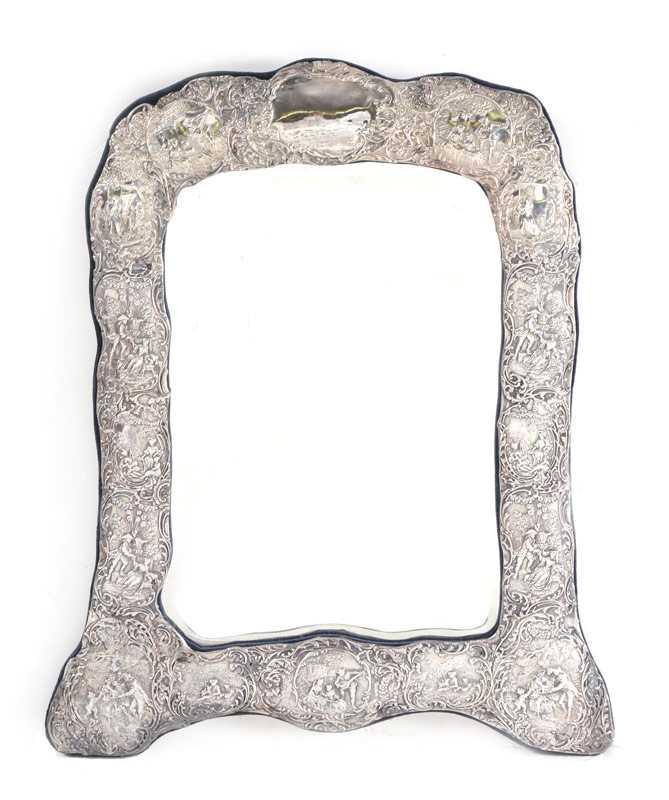 EMBOSSED FRAME WALL MIRROR: Silver toned metal framed embossed with French outdoor genre scenes. Shaped beveled glass mirror. 28'' h. x 23 1/2'' x 1 1/2''.