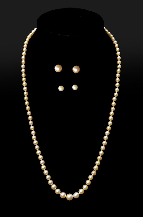 CULTURED PEARL NECKLACE AND 2 PAIRS OF EARRINGS: Graduated 3.00 - 7.50 mm cultured pearl necklace. 14K gold clasp. 2 pair of 14K earrings with 6.00 mm and 8.50 mm cultured pearls.