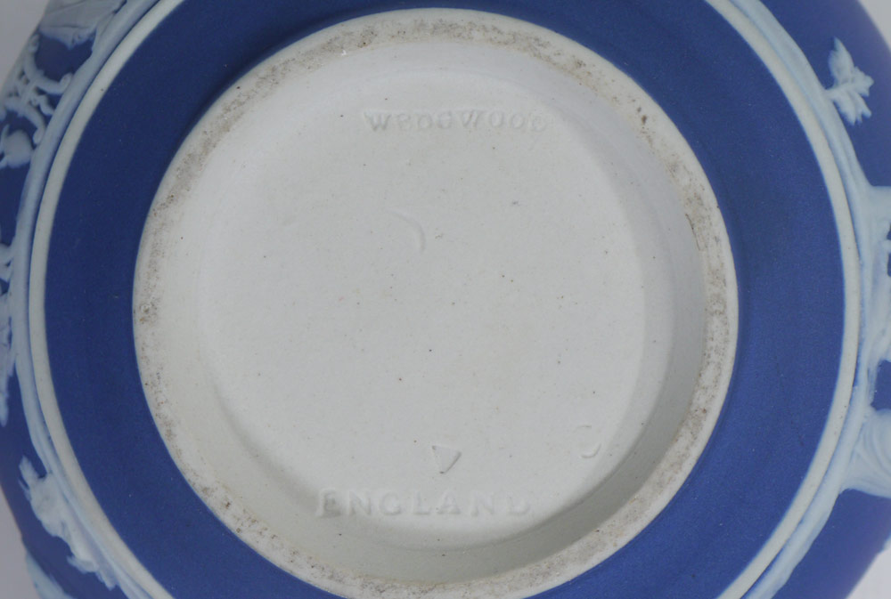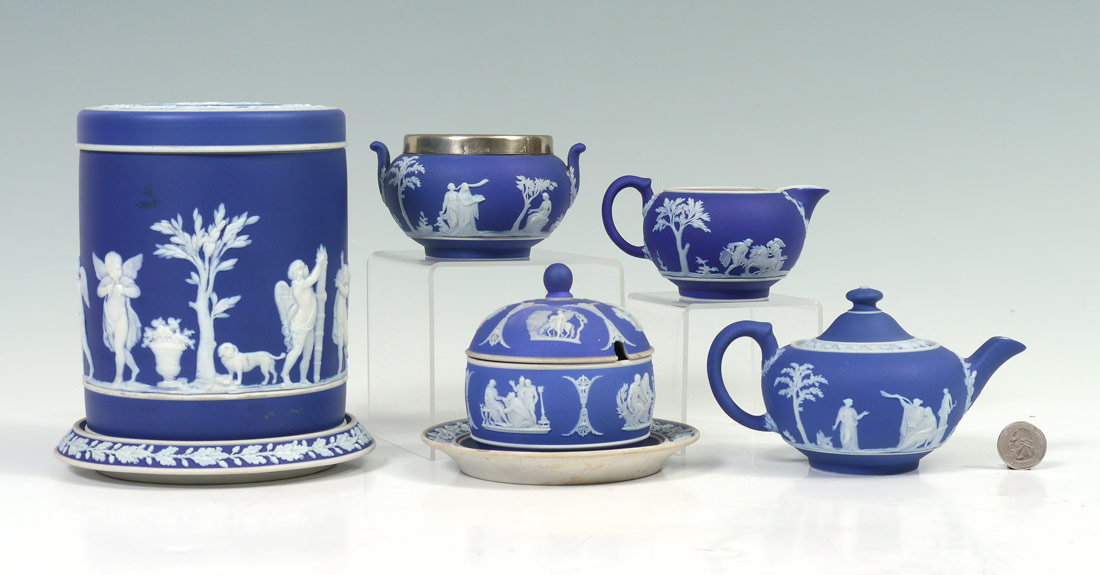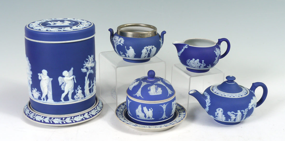 7 PIECE WEDGWOOD JASPER GROUP: Dark blue. Biscuit jar 6 1/2''h x 5'' dia. Small teapot, 3 1/2'', cream pitcher, silver rim open sugar, 2 1/2'', jam jar with attached underplate, 5 1/2'' dia., and a trivet, 6 1/2'' dia.