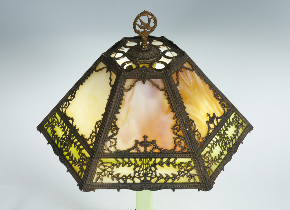 ONYX BASE SLAG GLASS LAMP: Base with green onyx and gilt metal sections, double socket fixture, measures 22 1/4'' h. x 5 3/4'' x 5 3/4''. Sold with a 6 panel slag glass shade with filigree metal frame. Shade measure 8'' x 15 3/8''.