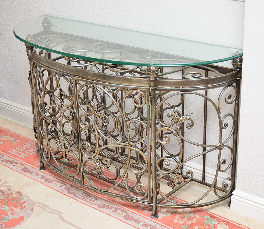 CONTEMPORARY IRON WINE RACK TABLE: Glass top over iron stand. Stores 24 bottles behind hinged, lockable doors. Measures approx. 30'' tall x 48'' x 18''.