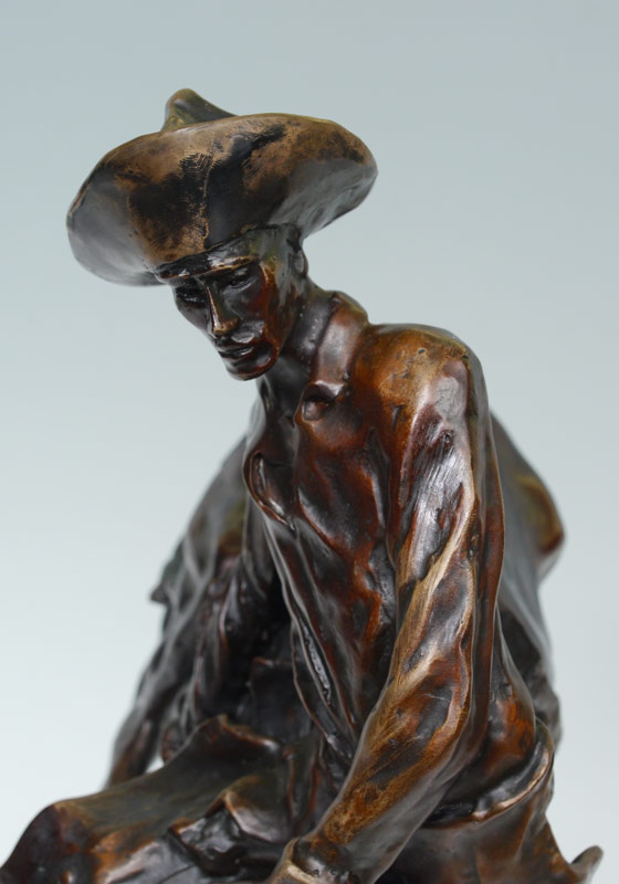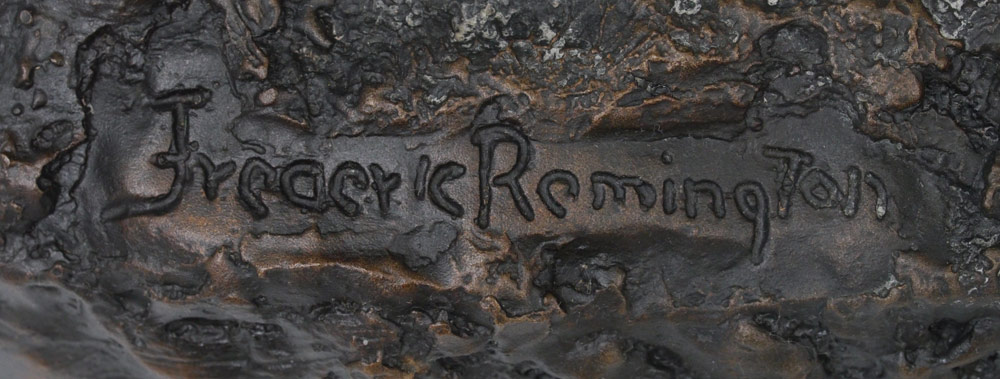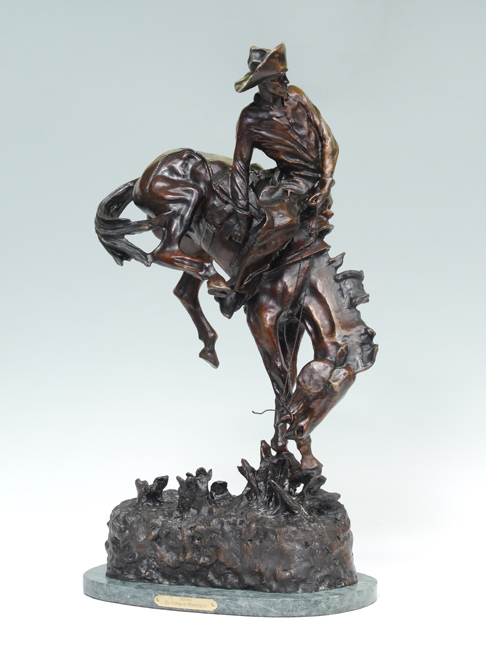 OUTLAW BRONZE AFTER REMINGTON: 24'' h., affixed to a variegated green marble plinth, 24 3/4'' overall.