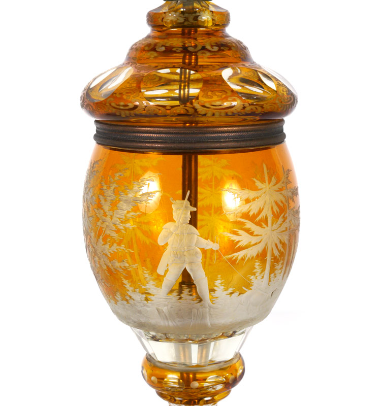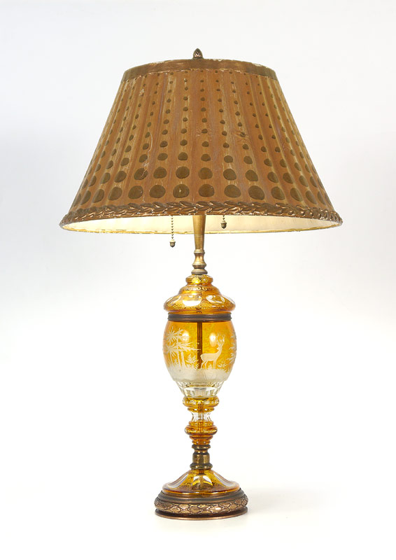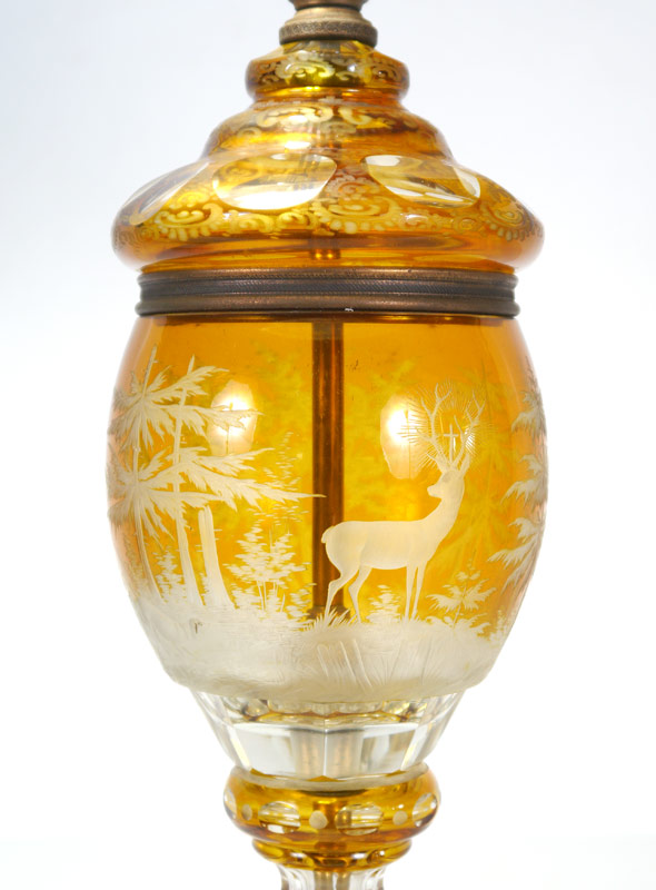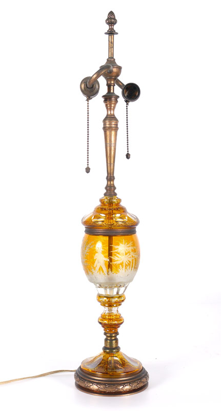 AMBER CUT TO CLEAR LAMP: Body with hunt scene, cast metal base, acorn pulls, double socket fixture. Overall measures 27'' h. x 5 1/2'' dia. Heavy paper scalloped shade, 10'' x 16 1/2''.