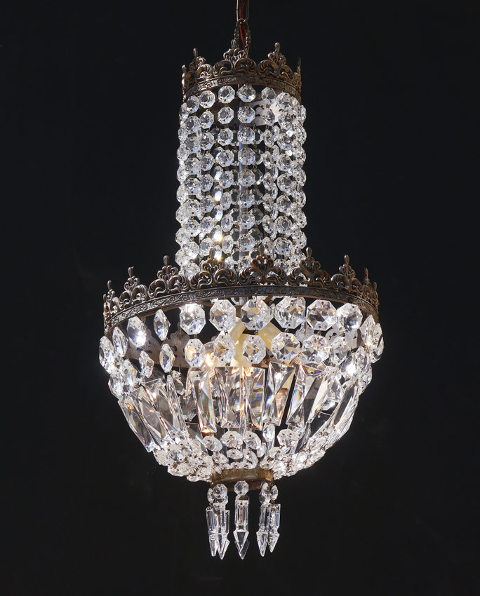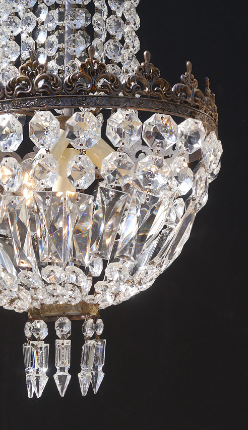 DIMINUTIVE CHANDELIER AND WALL SCONCES: Chandelier with 2 tiers of crystal garlands and drops, 4 light fixture. 21'' h. x 11 1/4'' dia. Sold with matching pair of wall sconces with no fixtures, 13 1/2'' h. x 5 1/2''.