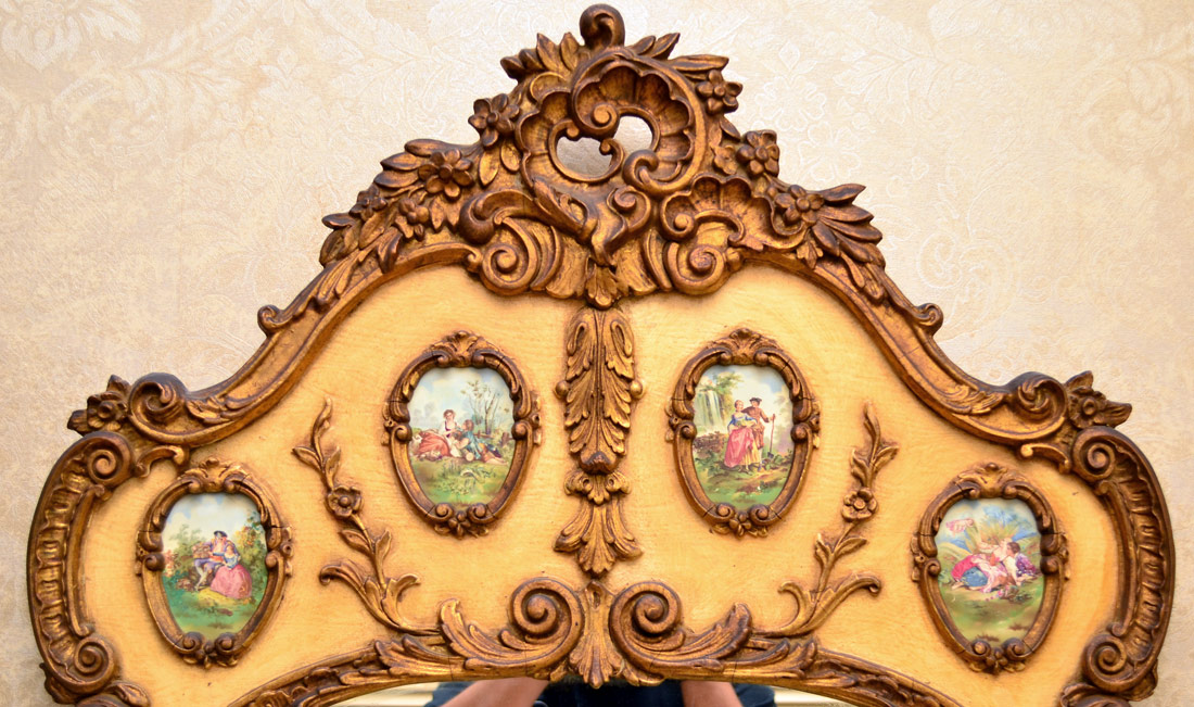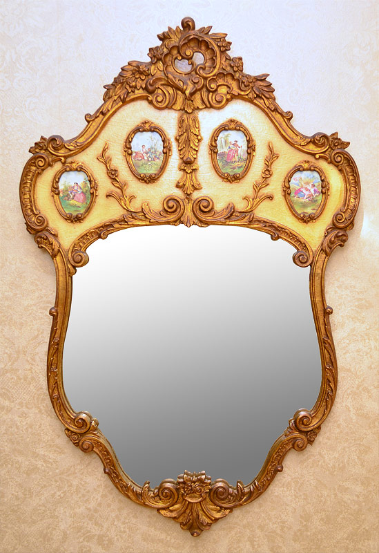 GOLD GILT & PORCELAIN WALL MIRROR: Carved and shaped gilt wood frame set with 4 porcelain plaques painted in outdoor lover genre scenes. Measures 43 1/2'' h. x 29''.