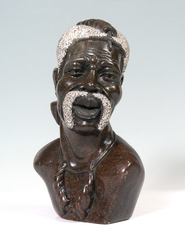 SHONA CARVED AFRICAN BUST OF MUSTACHED MAN: Unsigned, 13 1/4'' h. x 8 3/4'' x 7''.