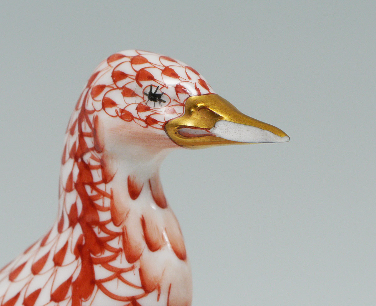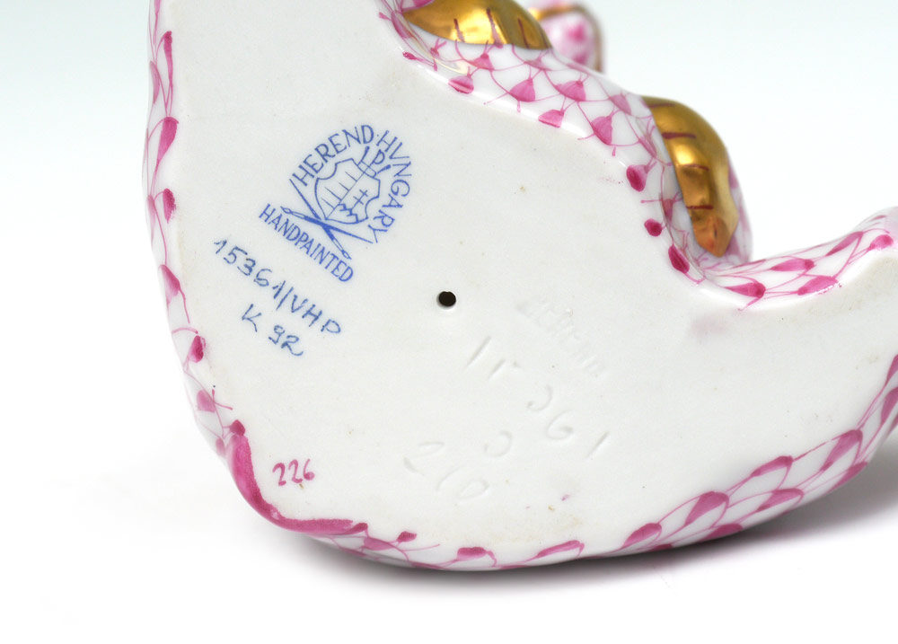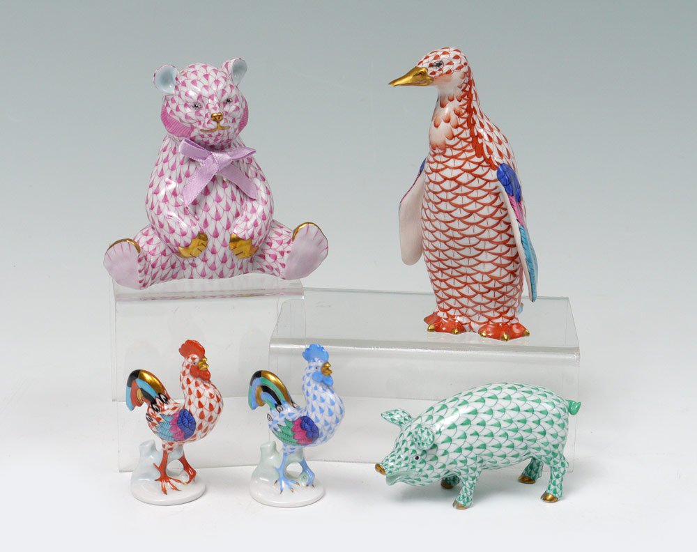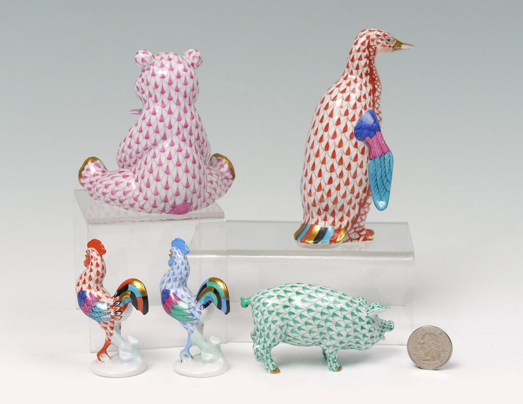 5 PIECE HEREND PORCELAIN ANIMALS: 1) Green Pig (2''). 2) Red Penguin (4 1/2''). 3) Pink Bear (4''). 4&5) A red and a blue rooster, (2 3/4'').