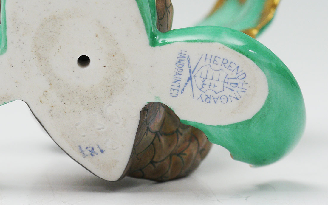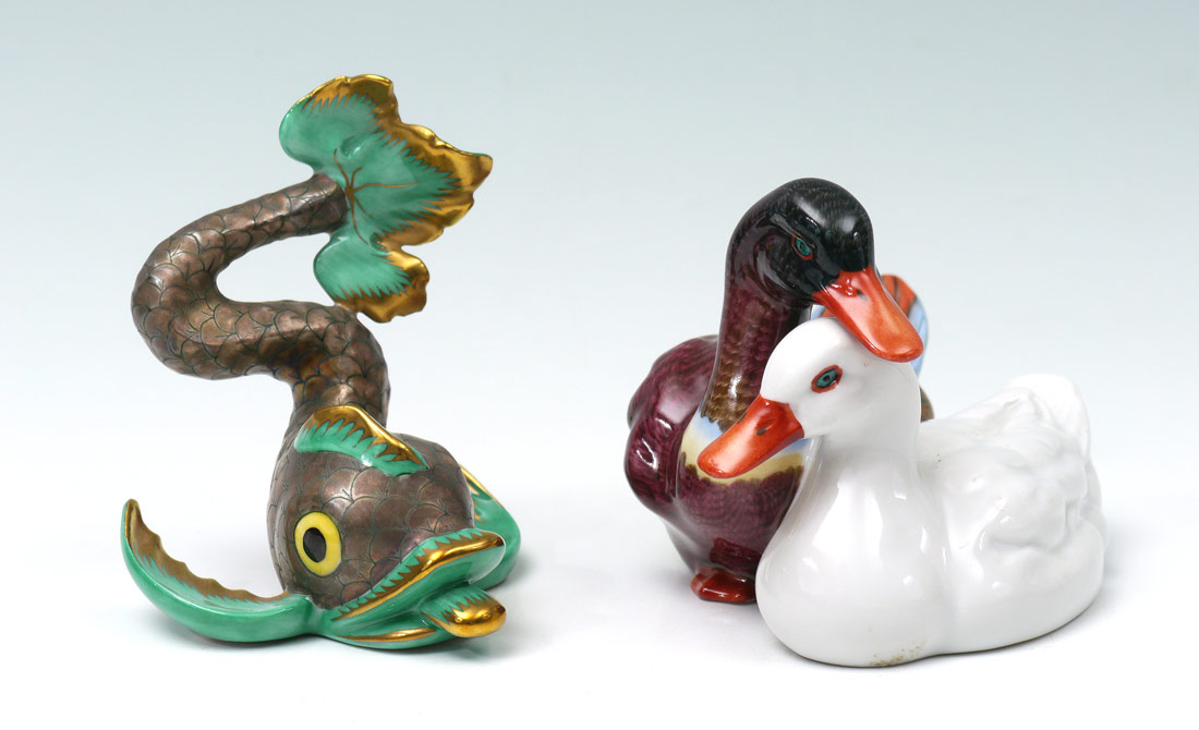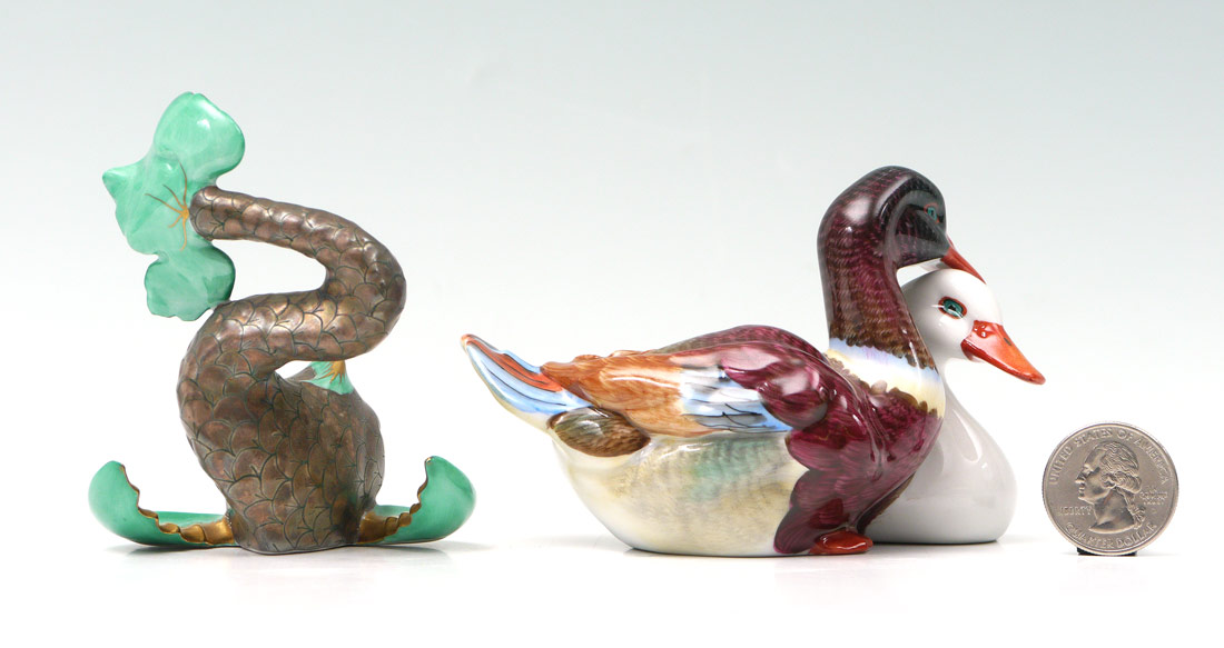 2 PIECE HEREND PORCELAIN ANIMALS: 1) Dolphin fish, (3 1/4''). 2) Natural color male and female ducks (2 3/4''.