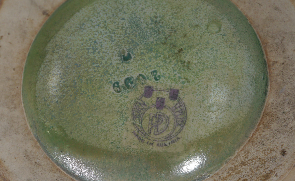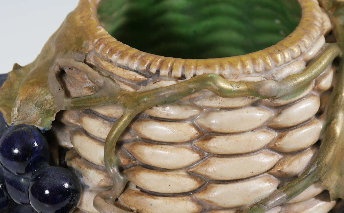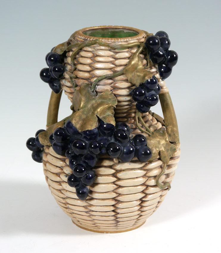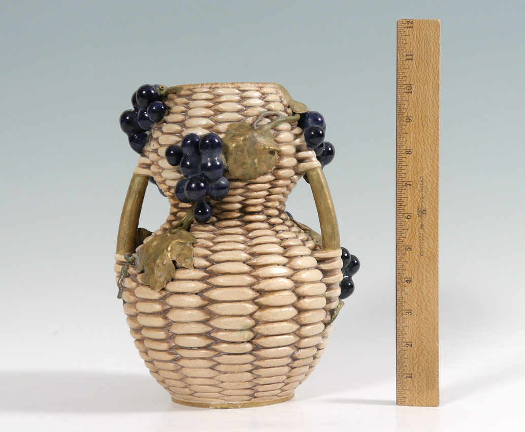 PAUL DASCHEL TEPLITZ VASE: Body with basket weave motif, 2 handles, applied grapes and leaves motif. Paul Daschel underglaze mark on base with impressed 2099 7. 10 1/4'' h. x 8'' dia.