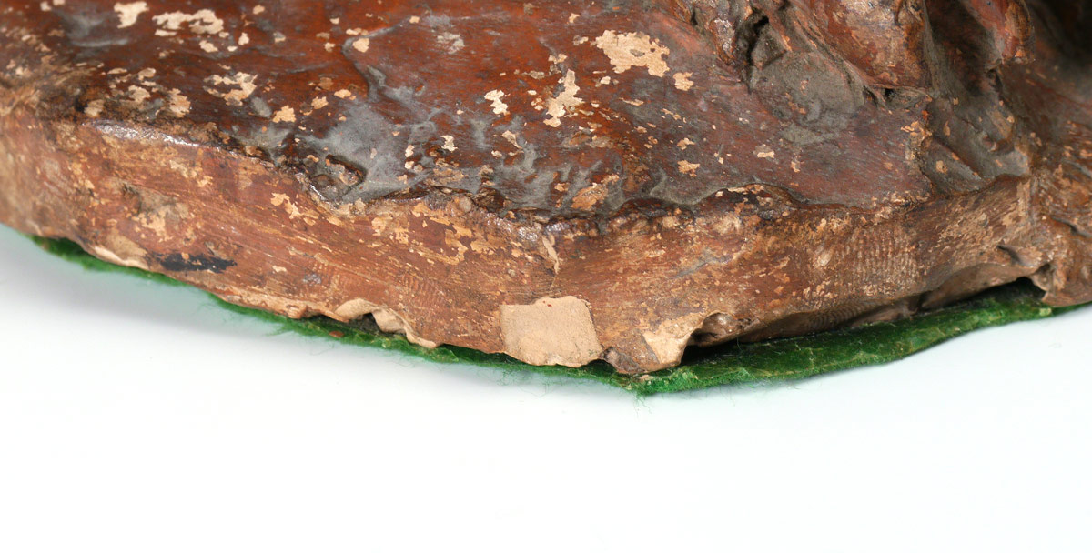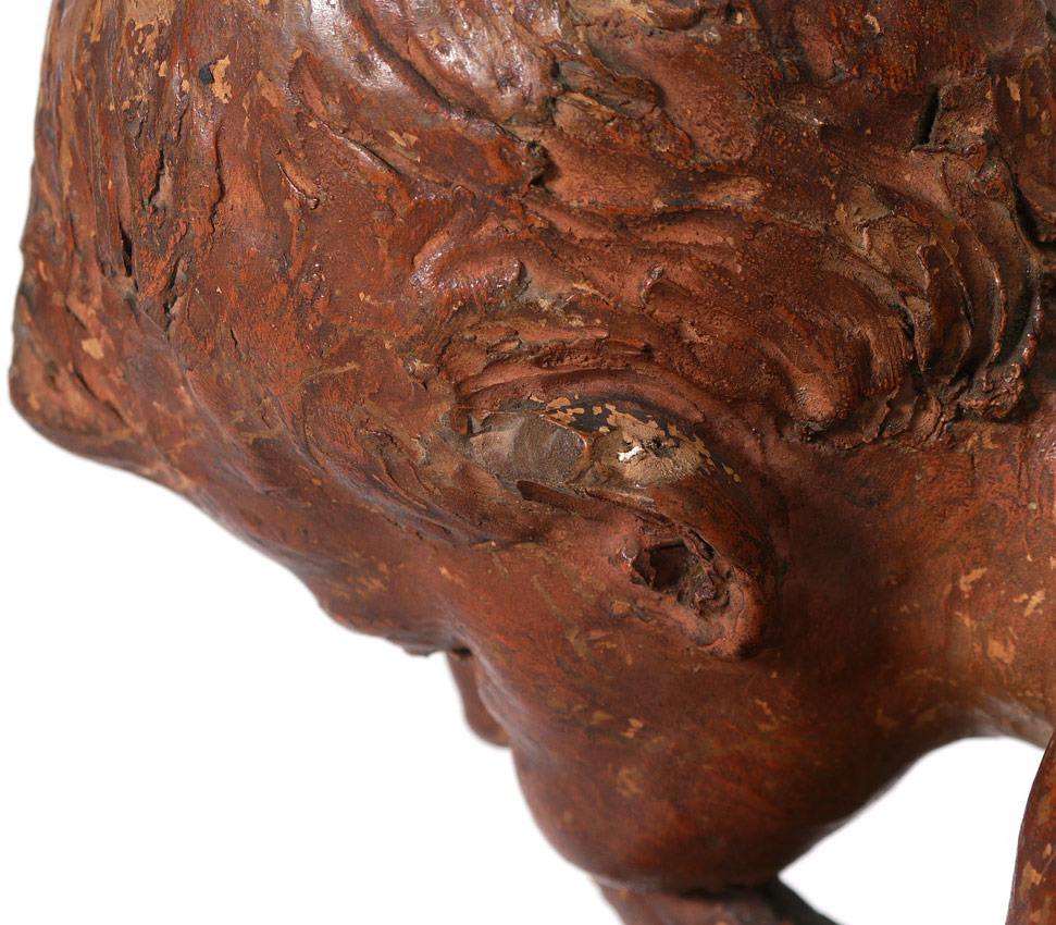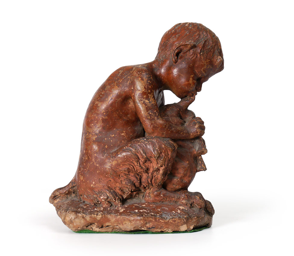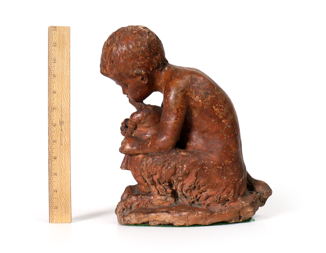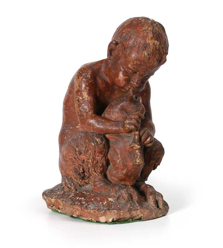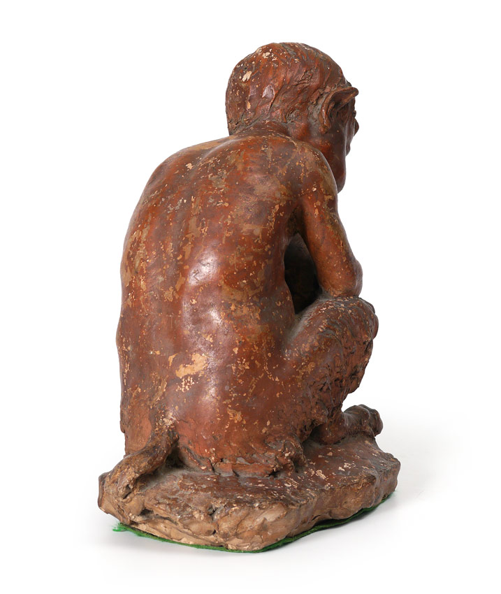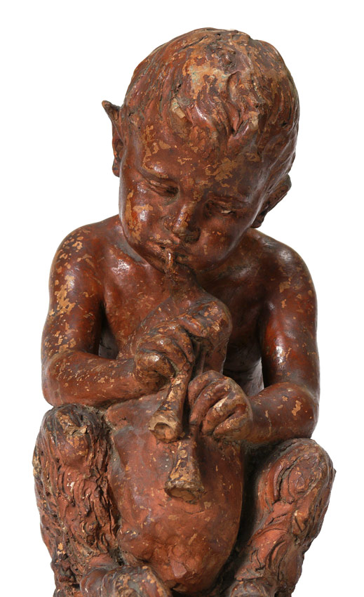 TERRA COTTA SCULPTURE OF A YOUNG SATYR: Figure of a child-like satyr playing bladder pipes, red painted figure. Unsigned. 12''h. x 10 3/4'' x 6''.
