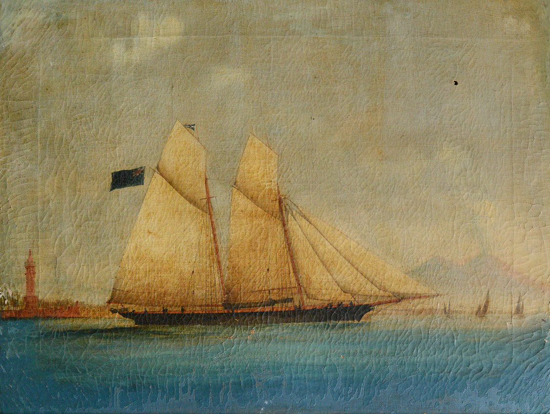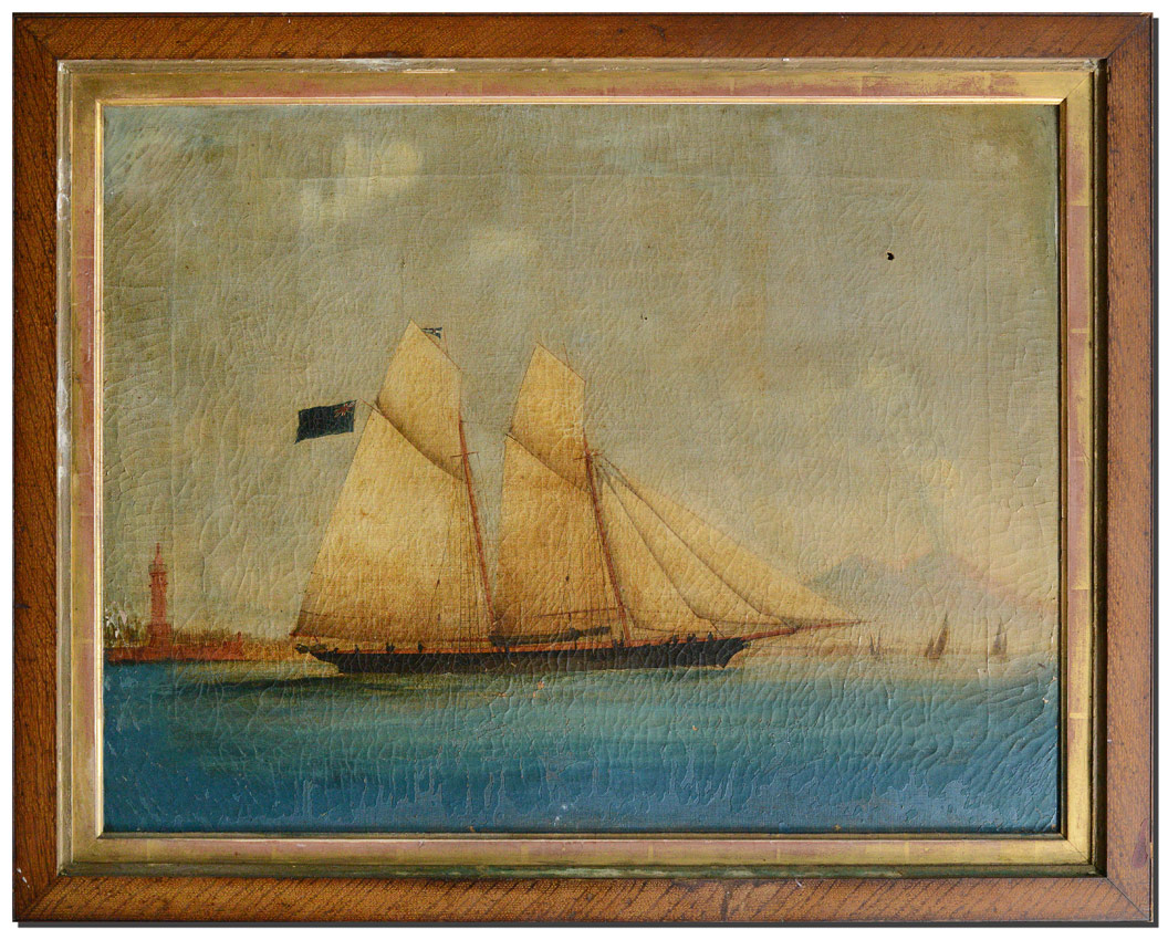 19TH CENTURY BRITISH CLIPPER SHIP PAINTING: In the Bay of Naples, with Vesuvius in the Background, Oil/Canvas, 18 1/2'' x 24 1/4'', no visible signature, encased in early quarter sawn oak frame with gilded liner showing wear in need of repair, 22 1/2'' x 28 1/4'', canvas marked verso, possibly later, with the initials D.M.O.