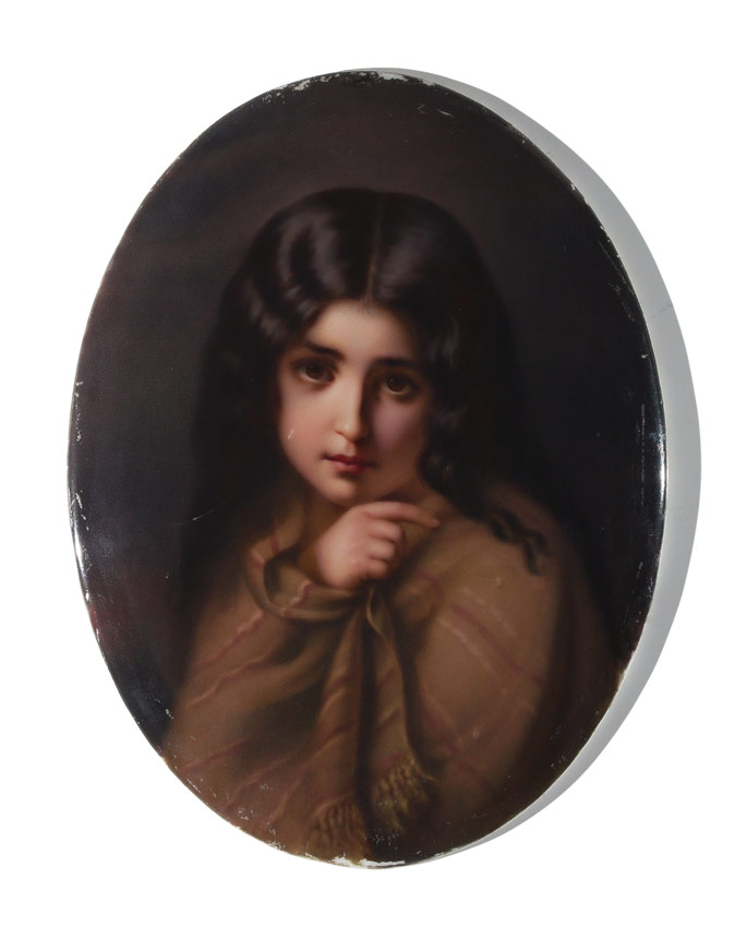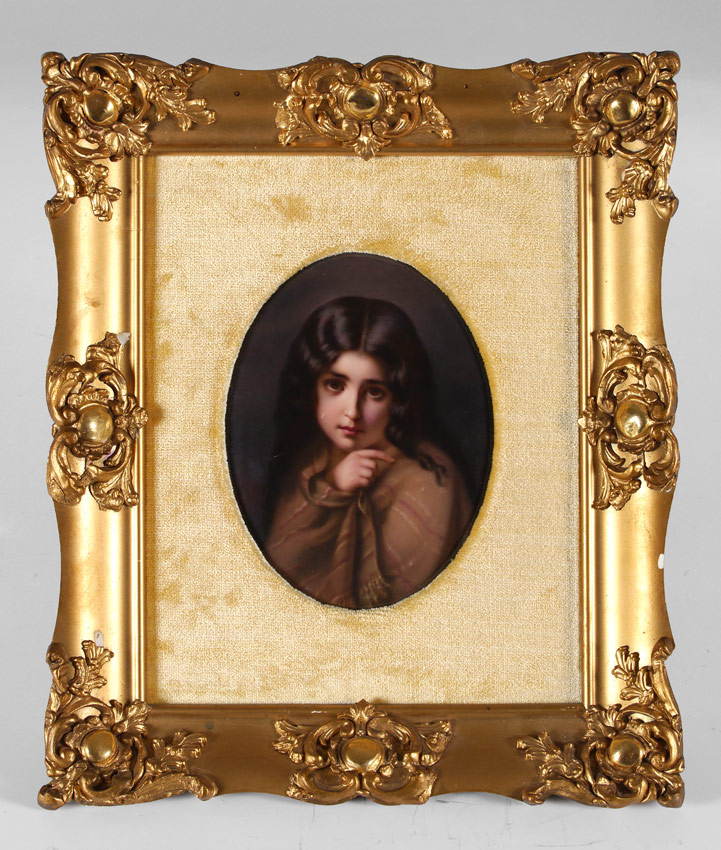 KPM Porcelain Portrait Plaque Painting of an Indigent Child after Jalabert: Sight size 6'' x 4 3/4'', impressed marking verso, encased in carved and gilded gesso frame with wear 13'' x 11''.