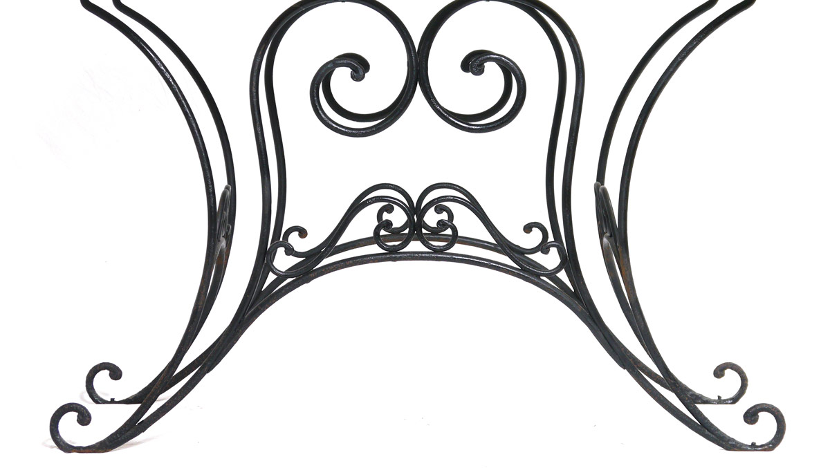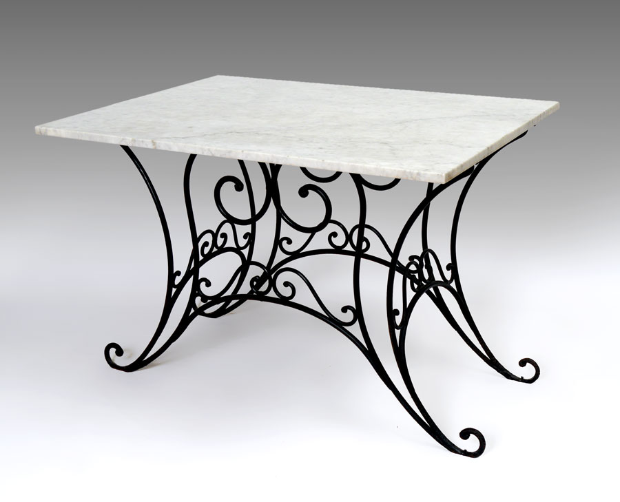 IRON BASE MARBLE TOP BAKERS TABLE: Variegated white marble top on scroll design cast iron base. Base measures 30 1/2'' h. x 48 1/2'' x 17 1/2'', top 45 1/4'' x 32 1/2''.