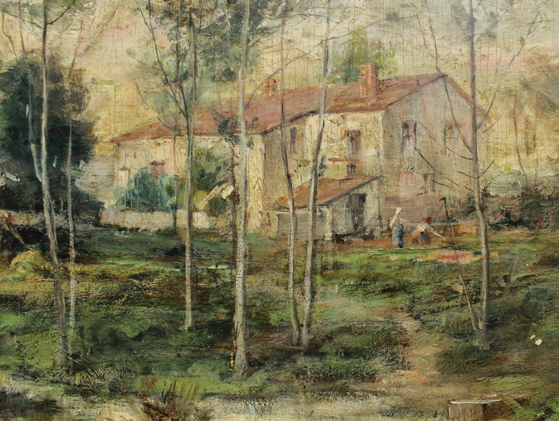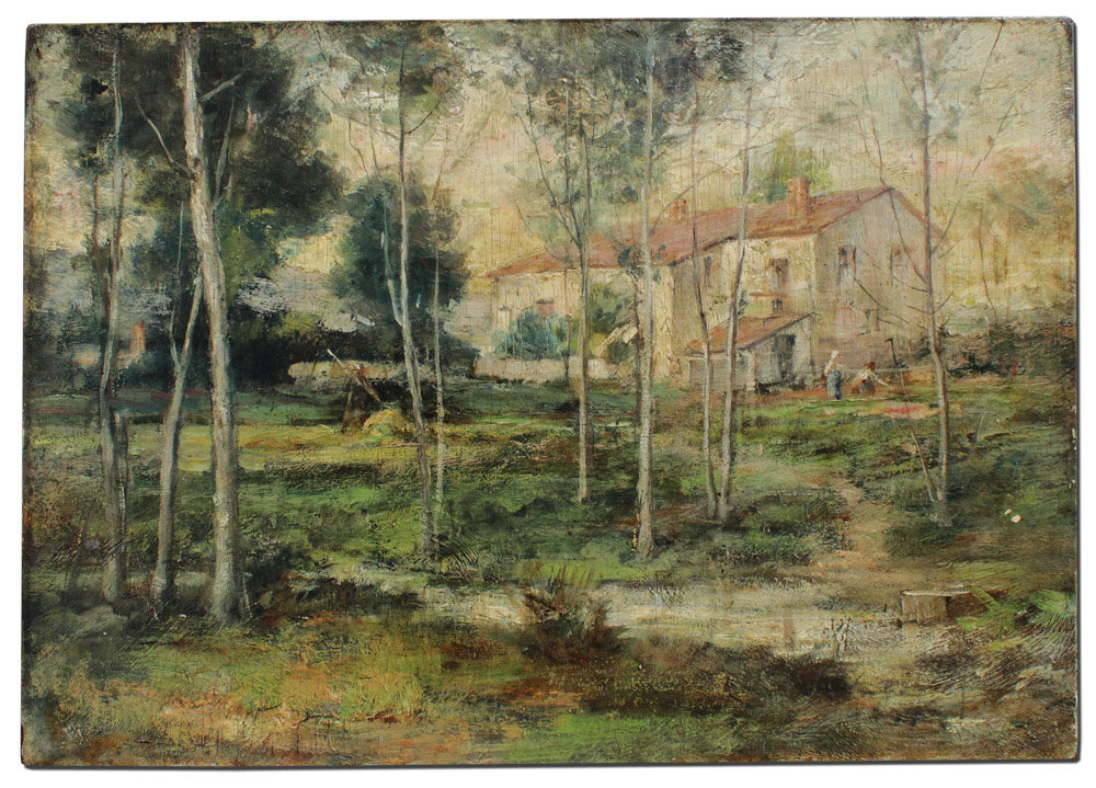 EXCEPTIONAL BARBIZON STYLE IMPRESSIONIST RURAL ESTATE PAINTING: No visible signature, Oil/Chamfered Wood Panel, 10'' x 14'', possible signature in the lower left corner, encased in period carved and gilded frame with wear 12'' x 16''.