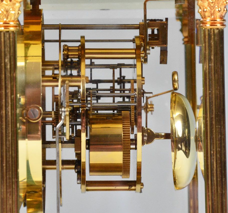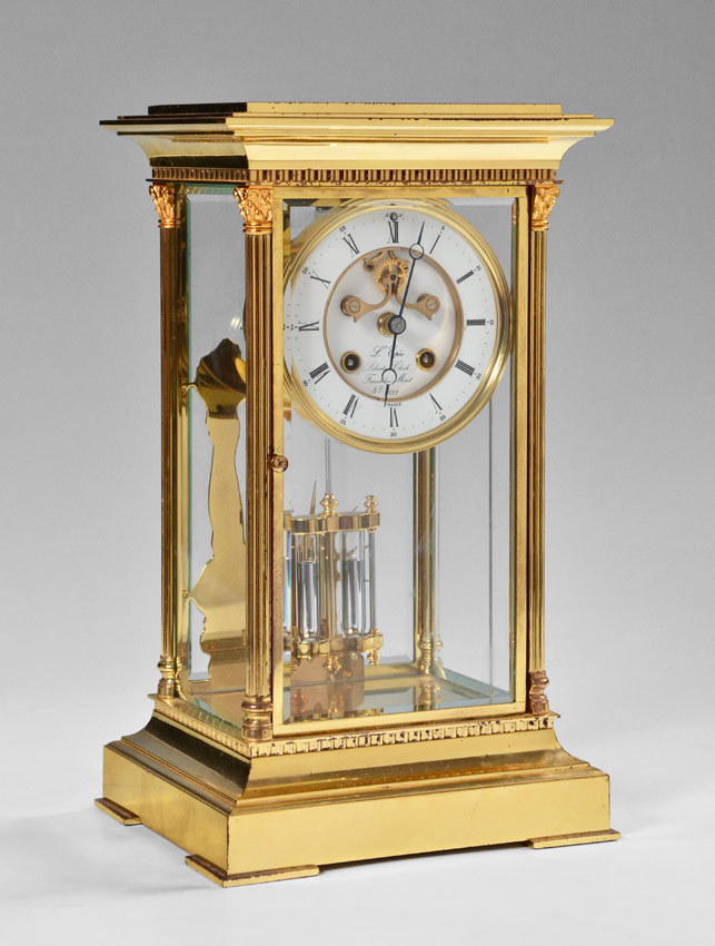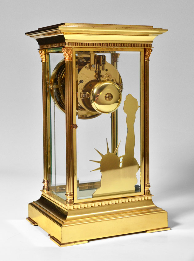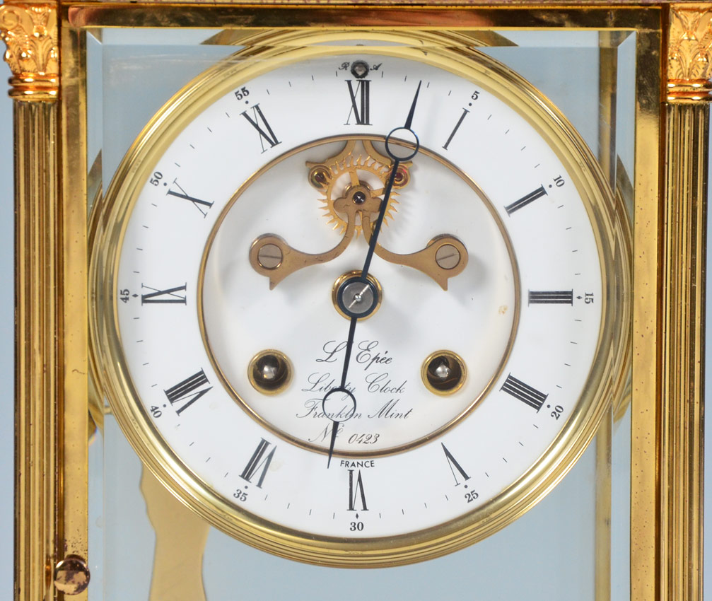 FRANKLIN MINT LIBERTY CRYSTAL REGULATOR CLOCK: Circa 1986, serial number 0423, produced by L'Epie for the Franklin Mint. Musical clock that plays both the American and French National anthems. Brass case with beveled glass sides, porcelain dial with open escapement, marked ''L'Epie, Liberty Clock, Franklin Mint, No. 0423''. Time and musical strike movement. Original documents included. Overall measures 13 1/4'' h. x 7 3/4'' x 6 1/2''.