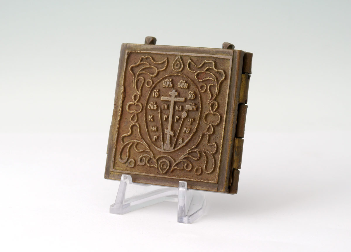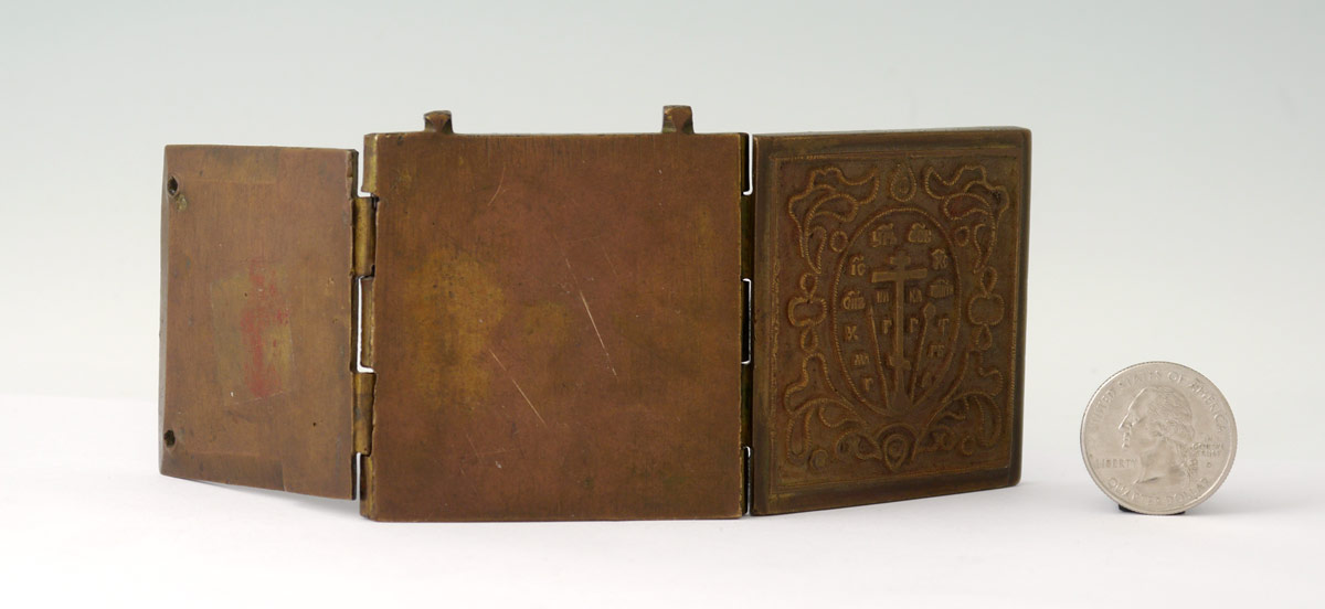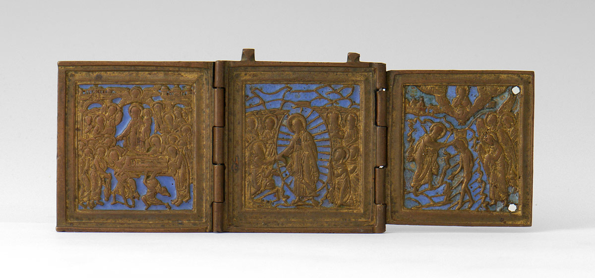 ENAMELED RUSSIAN RELIGIOUS TRIPTYCH: Diminutive folding triptych conveying the death and resurrection of Jesus. Bronze with blue enameled background, unmarked. Closed measures 2 3/8'' x 2 3/8''.