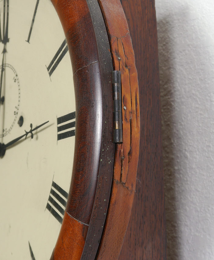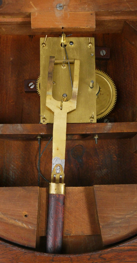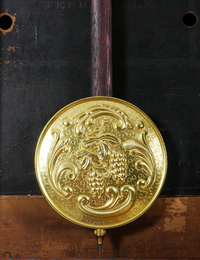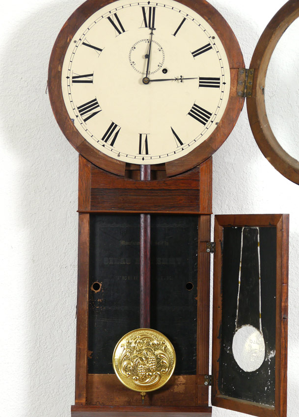 SILAS B. TERRY WALL REGULATOR CLOCK: Rosewood case, painted metal dial with Roman numerals and second dial with Arabic numerals. Reverse painted lower glass. Time only movement. Overall measures 33'' h. x 14 1/2'' x 4''.