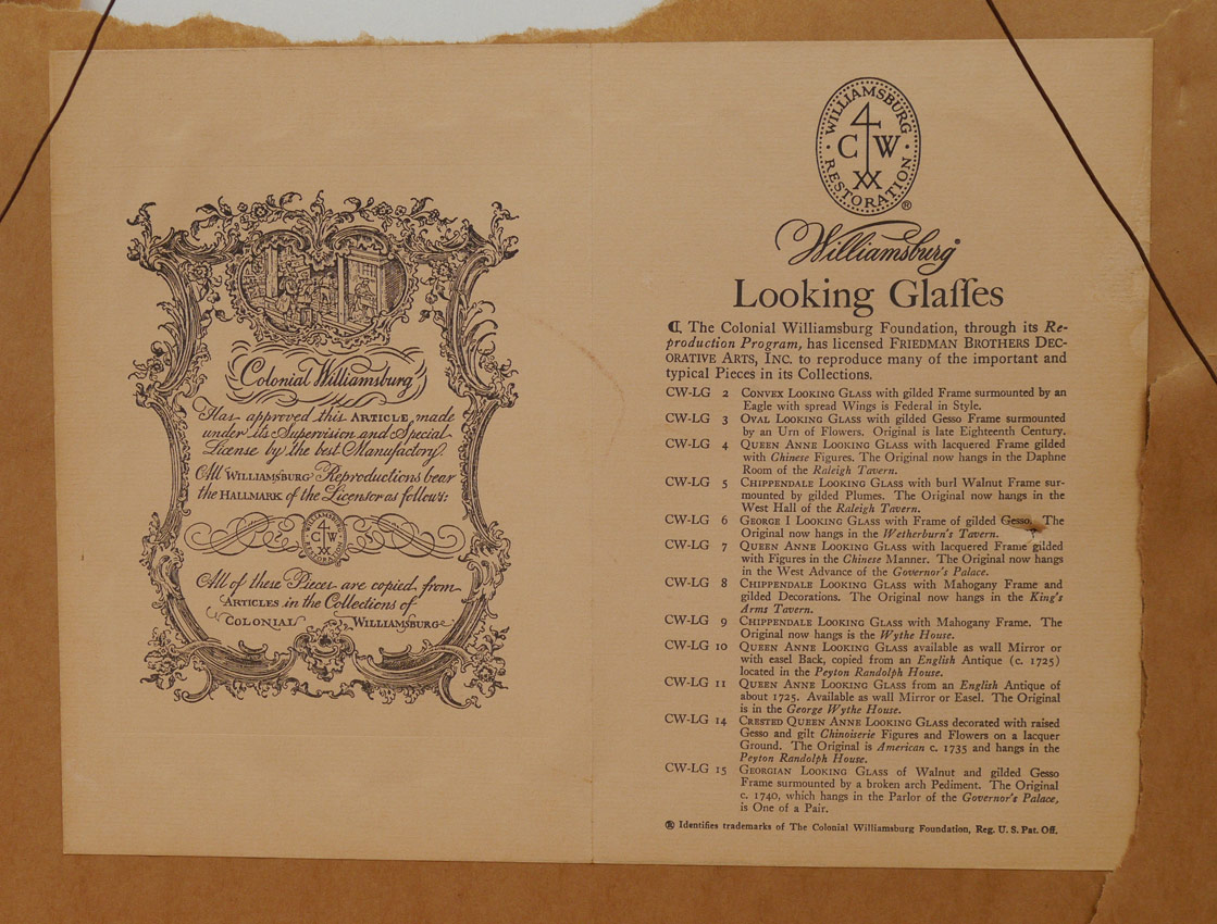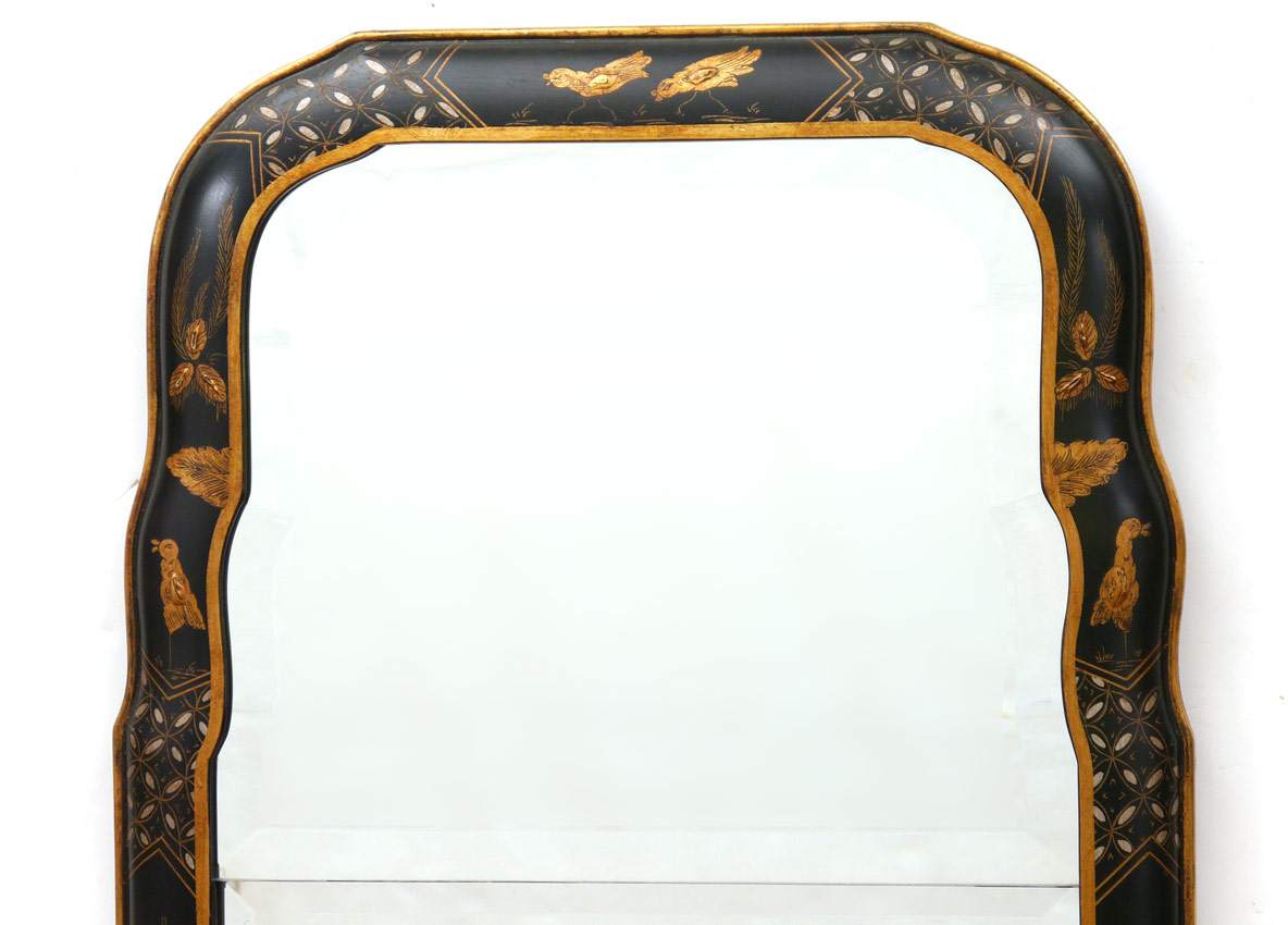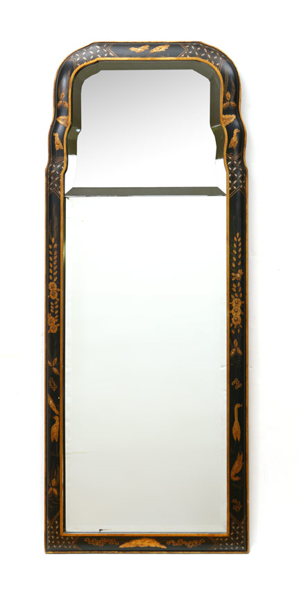 COLONIAL WILLIAMSBURG CHINOISERIE DECORATED MIRROR: Gold on black, beveled and shaped mirror. Measures approx. 48'' X 17''