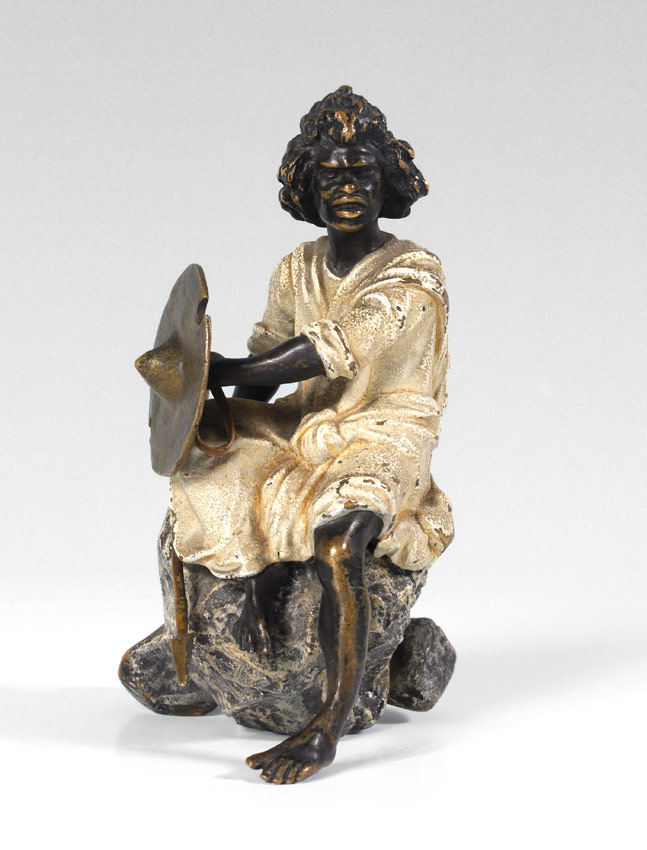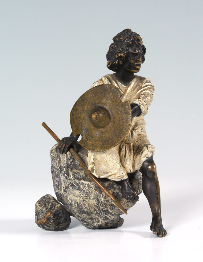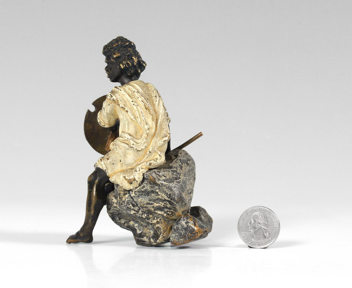 COLD PAINTED MINIATURE BRONZE OF A MOORISH WARRIOR: Seated on a Rock Holding Shield and Spear, impressed marking Geschutz, 5'' h.