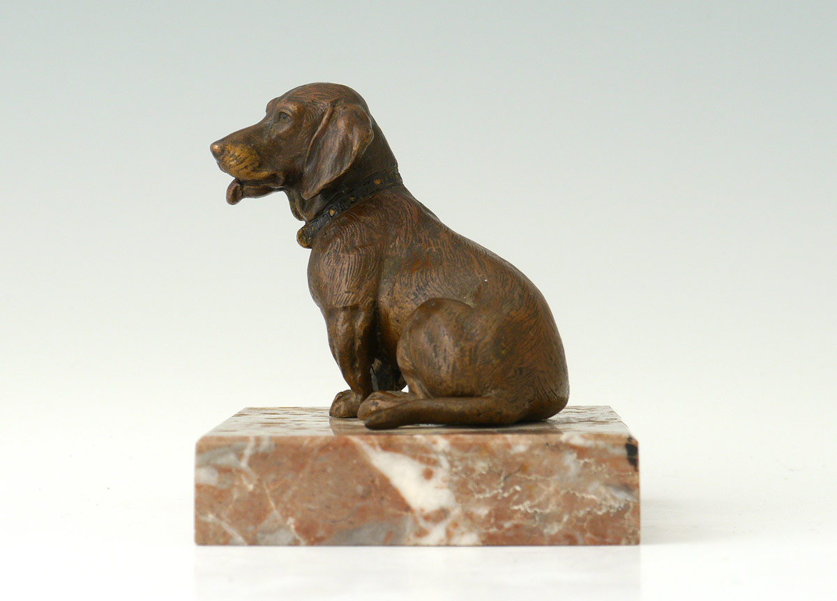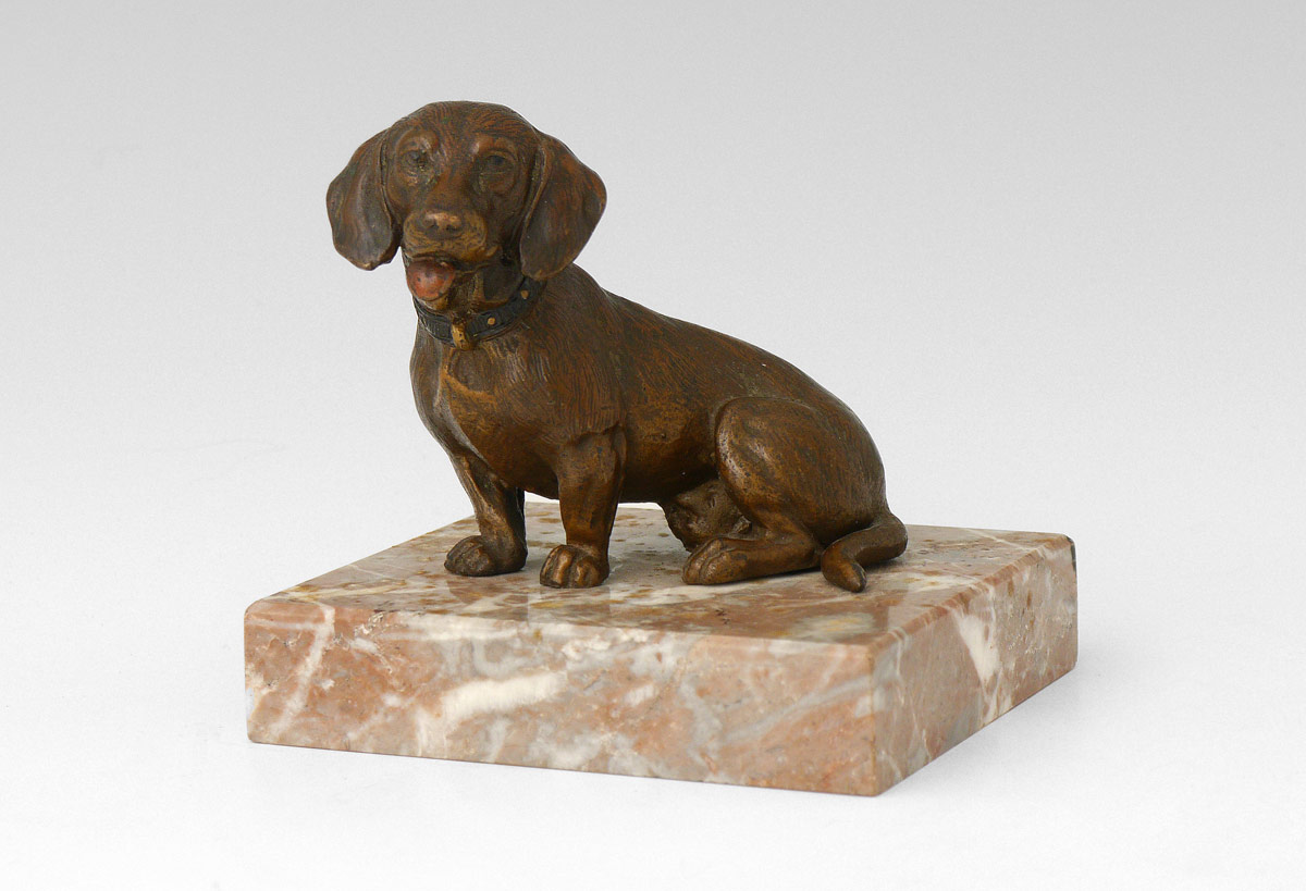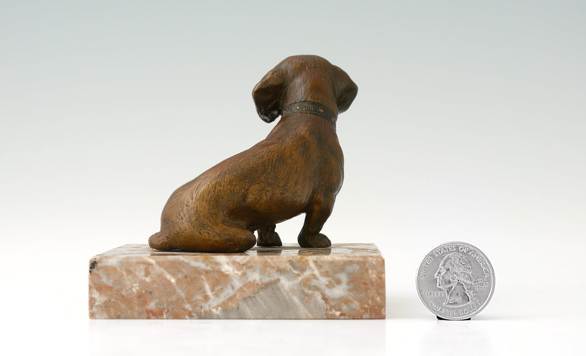COLD PAINTED BRONZE DACHSHUND MINIATURE SCULPTURE: Probably Austrian, 2 5 /8'' h. x 2 1/2'' w., affixed to a marble base, 3 1/2'' overall, no visible maker's mark.