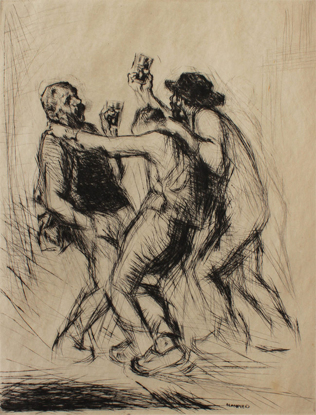 BLAMPIED, Edmund, (British, 1886-1966): ''Cider Drinkers'', 2nd Proof Etching, size with margins 15 5/8'' x 10'', signed lower mid margin, illegibly dedication lower left with artist's initials, marked lower right 2nd Proof, March 1925, titled in pencil verso, signed in the plate, worn frame 27 1/2'' x 21 1/2''.