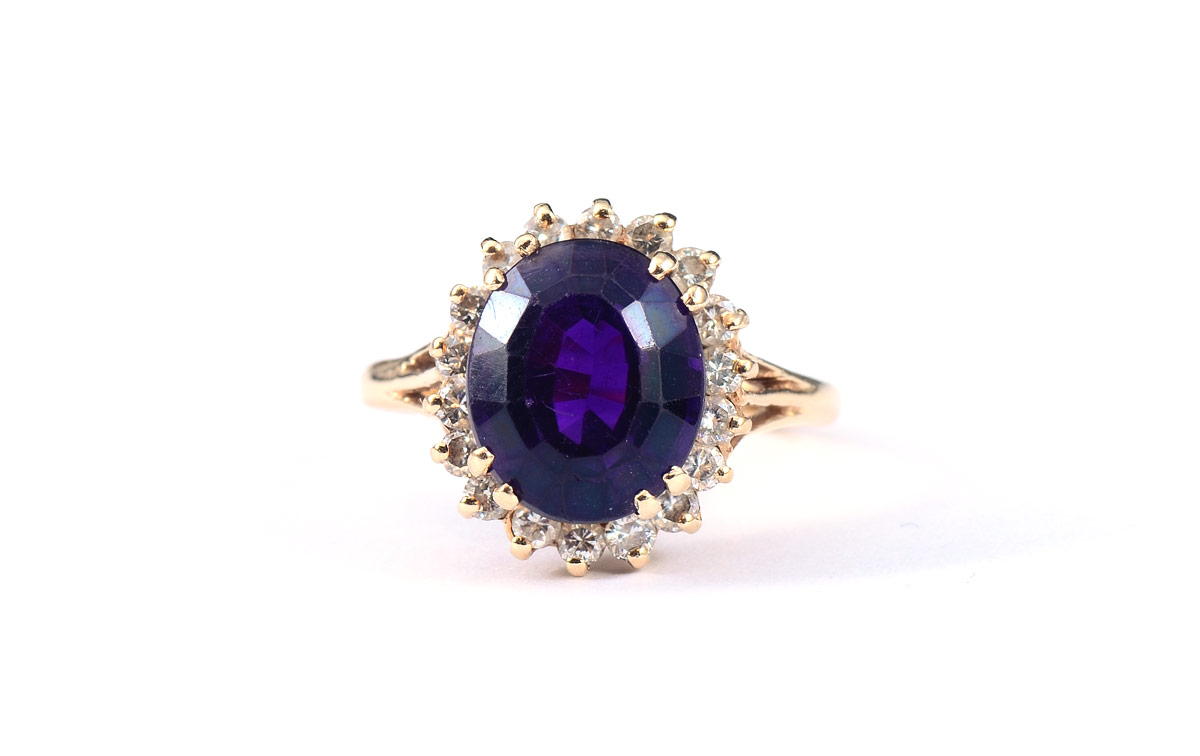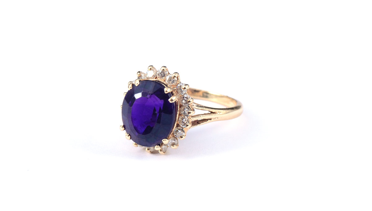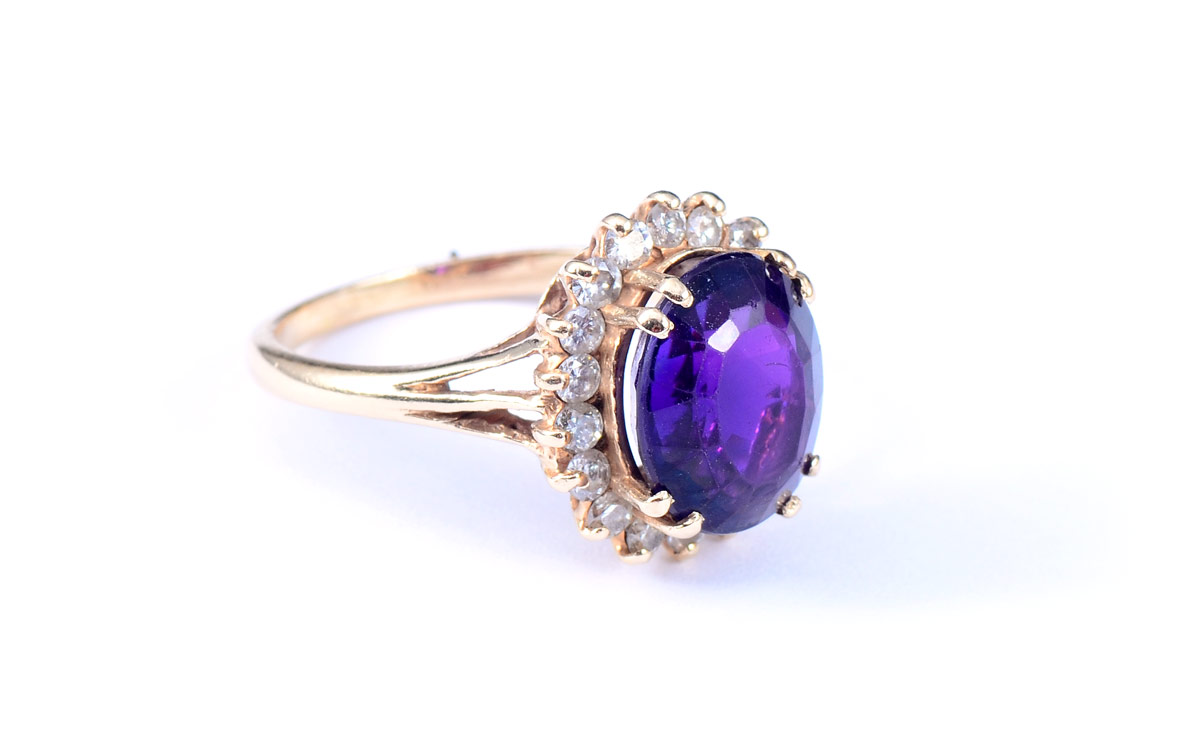 5 CT AMETHYST & DIAMOND RING: 14K yellow gold ring centers one oval shaped mixed cut amethyst. WEIGHT: 5.00 Ct. Approx. Rated VVS in clarity (Type I), P in Hue, 6 in Tone and 3-4 in Saturation. Framed by 18 round brilliant cut diamonds totaling approx. .75 Ct. Rated VS in clarity and H-I in color. The amethyst and diamonds are prong set. Weight: 5.0 grams. Size: 8