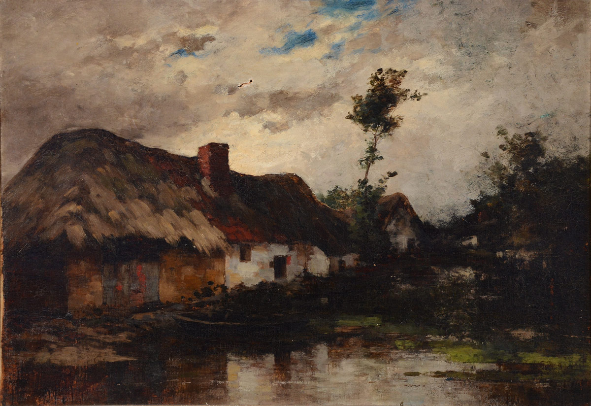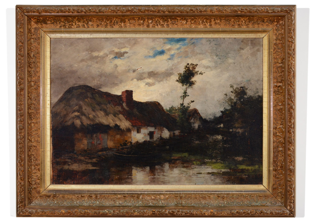 GOOD LATE 19TH/EARLY 20TH CENTURY RIVER VILLAGE PAINTING: Oil/Canvas, 14'' x 20'', encased in a gilded gesso molding with foliate motif 19 1/2'' x 25 1/2'', no visible signature.