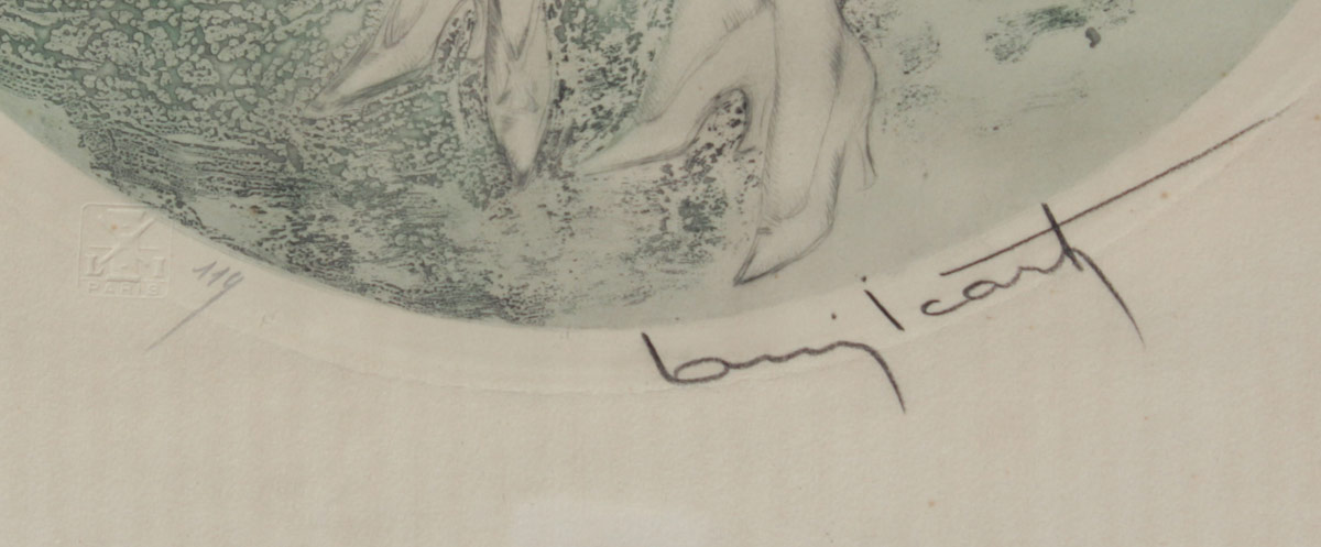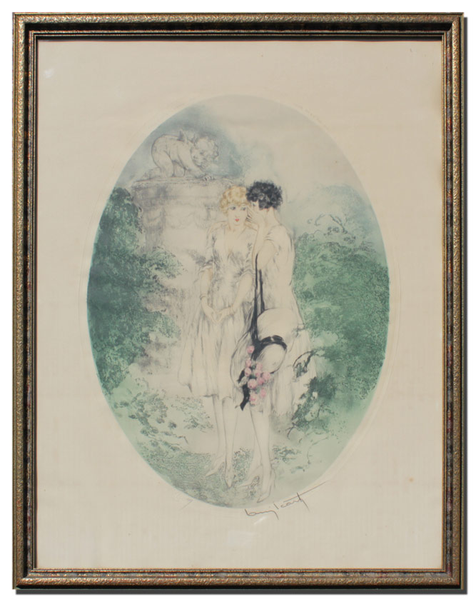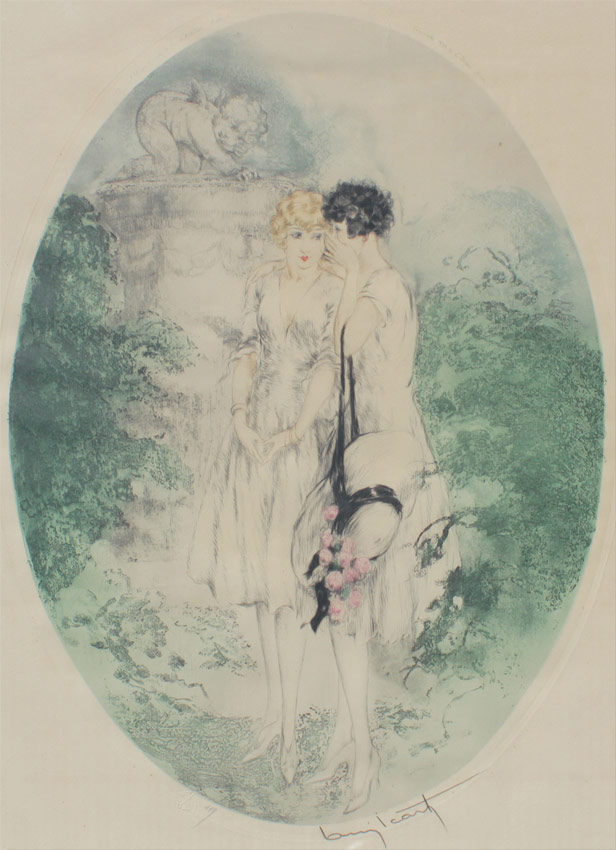 ICART, Louis, (French, 1888-1950): ''Eavesdropping'', Colored Etching, Full size with margins, 24'' x 19 1/4'', pencil signed lower right, windmill blind stamp lower left, #'d 114, embossed and gilded frame 25 3/4'' x 21''.