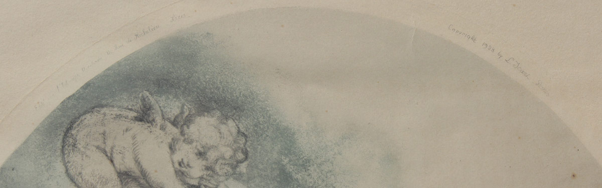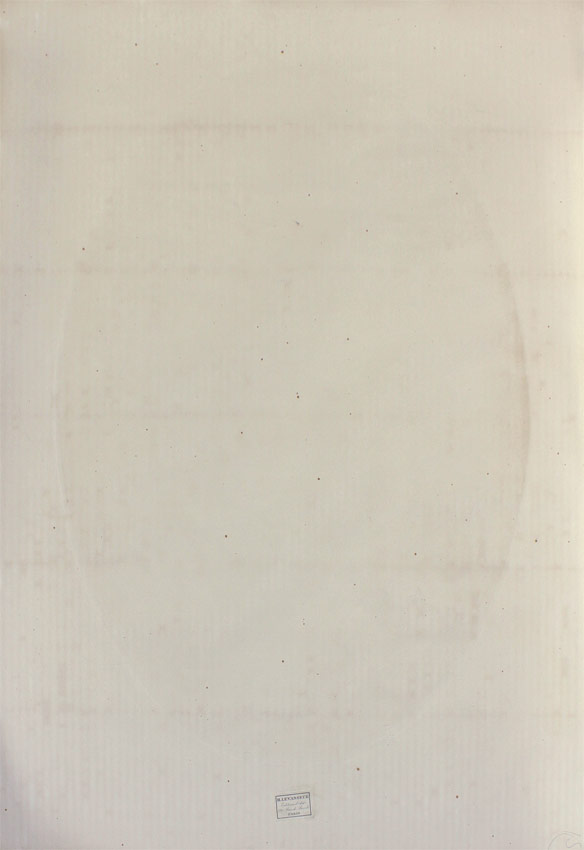 CONDITION: Several scattered spots of foxing, several scattered spots of staining with overall vertical bleed through burn from backing, small crease in upper oval margin, glue mark bleed through in lower margin from H. Levasseur dealer stamp, Paris, not laid, full margins.