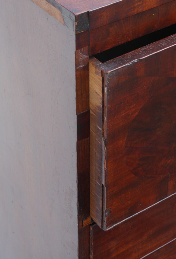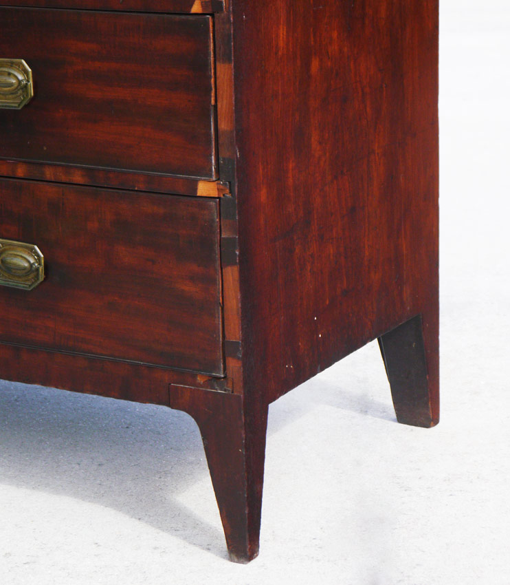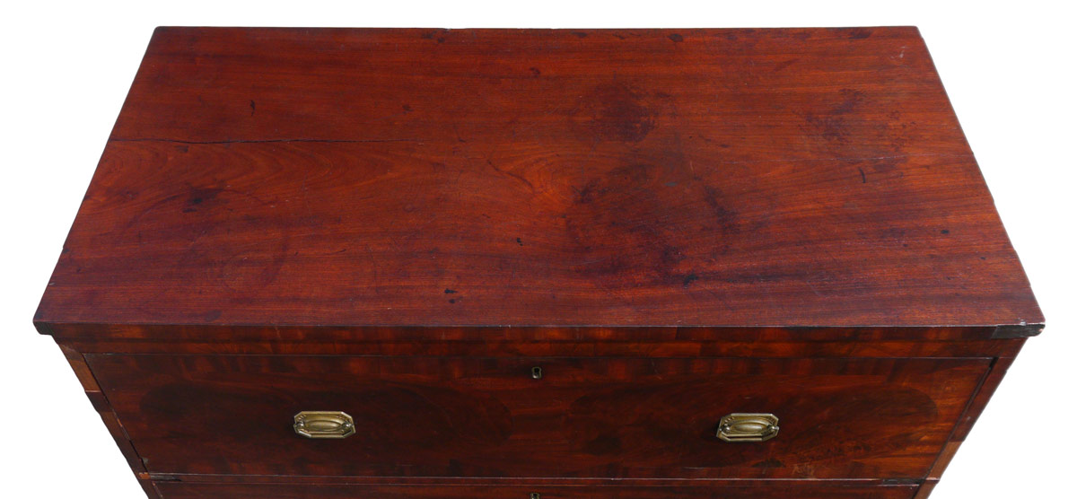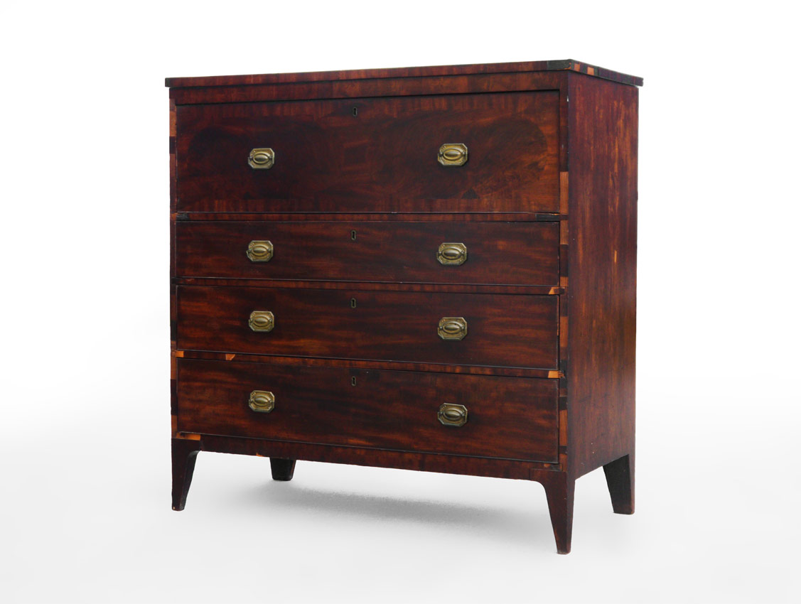 EARLY 4 DRAWER CHEST OF DRAWERS: 19th century mahogany veneer with double deep top drawer over 3 regular size drawers, tapered legs. Original brass pulls. Overall 46 1/4'' h. x 45 1/2'' x 22 1/2''.
