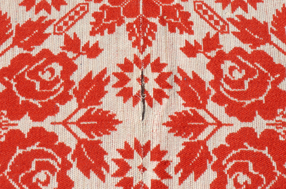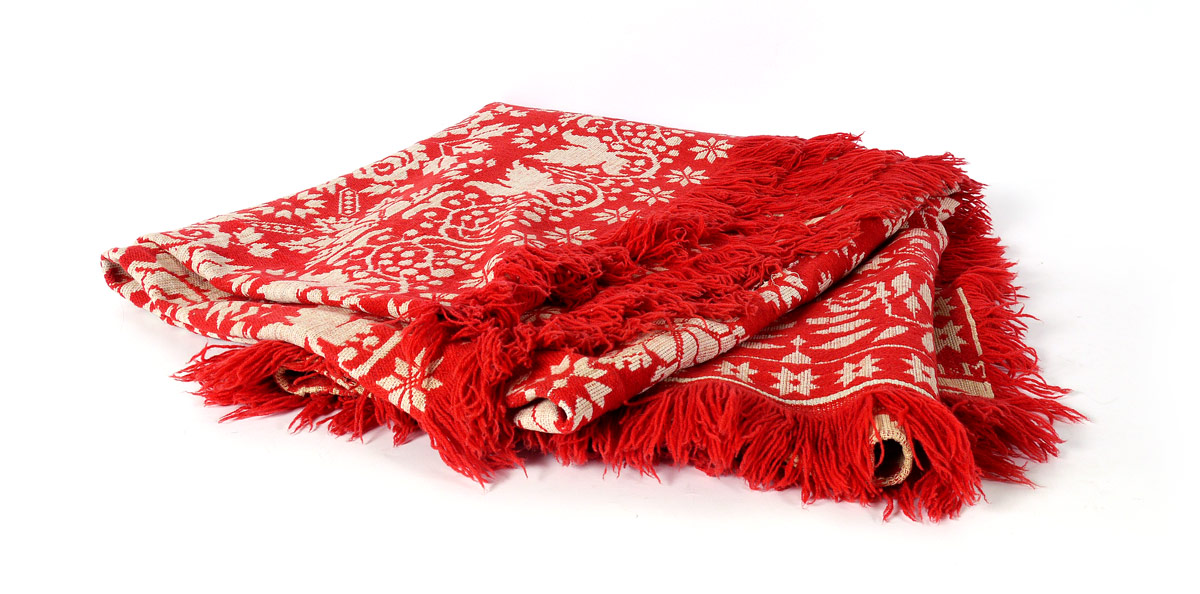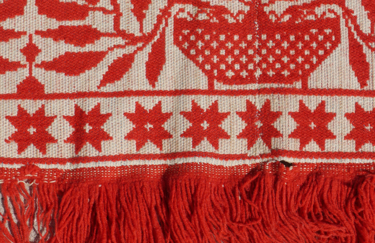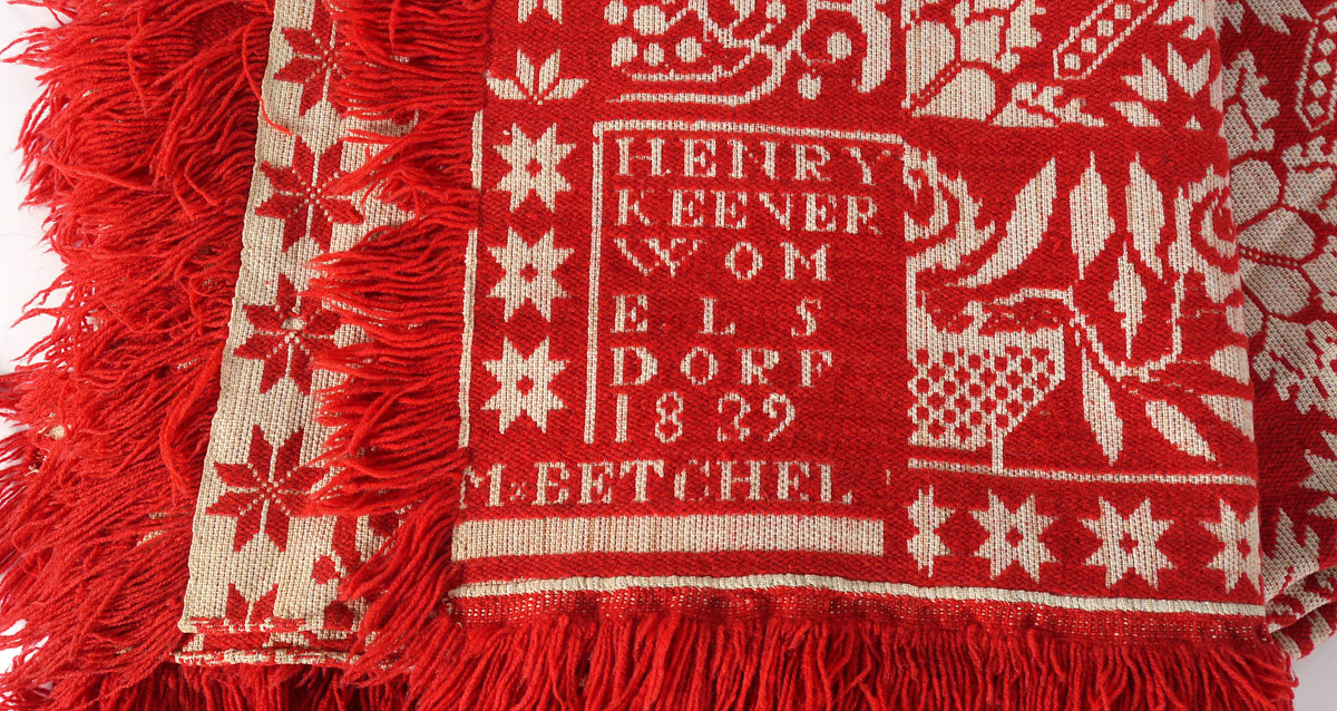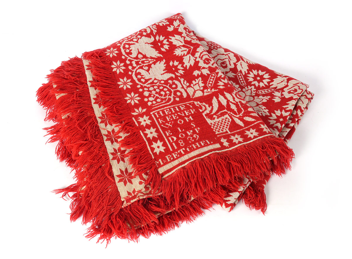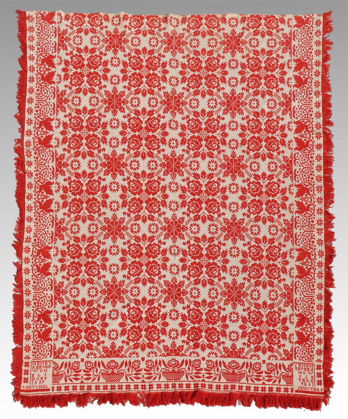 SIGNED AND DATED 1839 HENRY KEEVER WOMELSDORF JACQUARD COVERLET: Bechtel Pennsylvania. Woven in two colors in a rose and star design. Measures approx. 91'' x 74''.