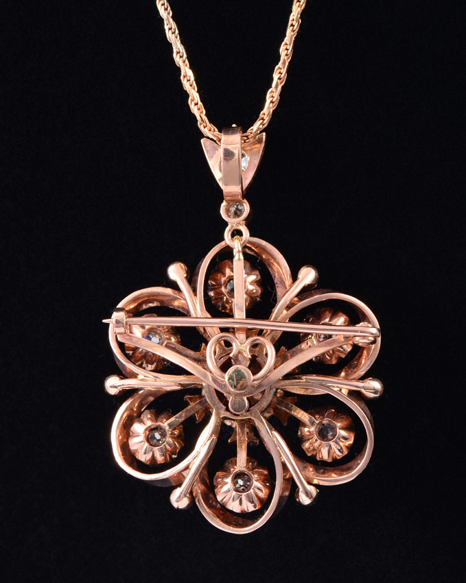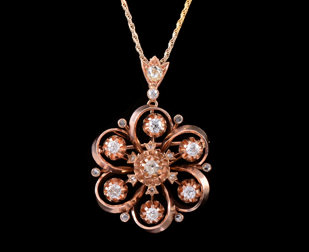 ROSE GOLD ANTIQUE DIAMOND PENDANT NECKLACE: Ca. 1910. A classic that never grows old. 14K rose gold pendant brooch with diamond set hinged bail. There are 7 early old European round and old mine cut diamonds and 12 round rose cut diamonds totaling 1.00 Ct., averaging VS-SI in clarity and H-I-J color. Prong and bezel set. The 19'' chain is 18K. Sold with current Atlanta Gemological GIA graduate's appraisal for the pendant $3,550.