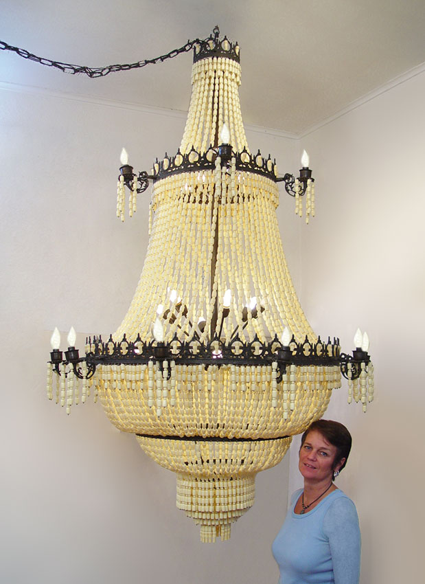PALATIAL 7 FT TALL 6 TIER CHANDELIER CALLED ''THE DE LA AZIZE'': Imported by Asia Minor Carpets. Faux ivory beads draped on a metal frame. Approx. 7' h. x 4'5'' dia.