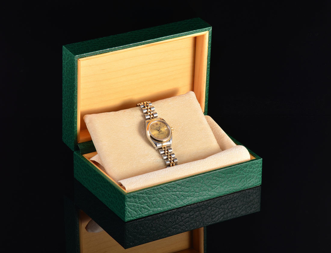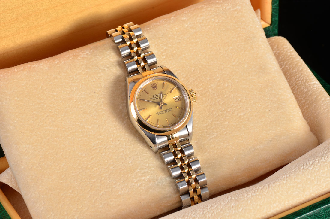 LADIES ROLEX JUBILEE WRIST WATCH: 18K yellow gold and stainless steel watch ca. 1990. Model 69173. Oyster perpetual date just, quick set. The dial with smooth bezel, sapphire crystal, gold dial and markers. Serial number E238xxx. Length approx. 6.5''. Sold in the presentation box in box.