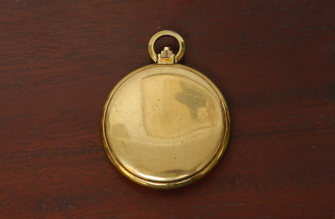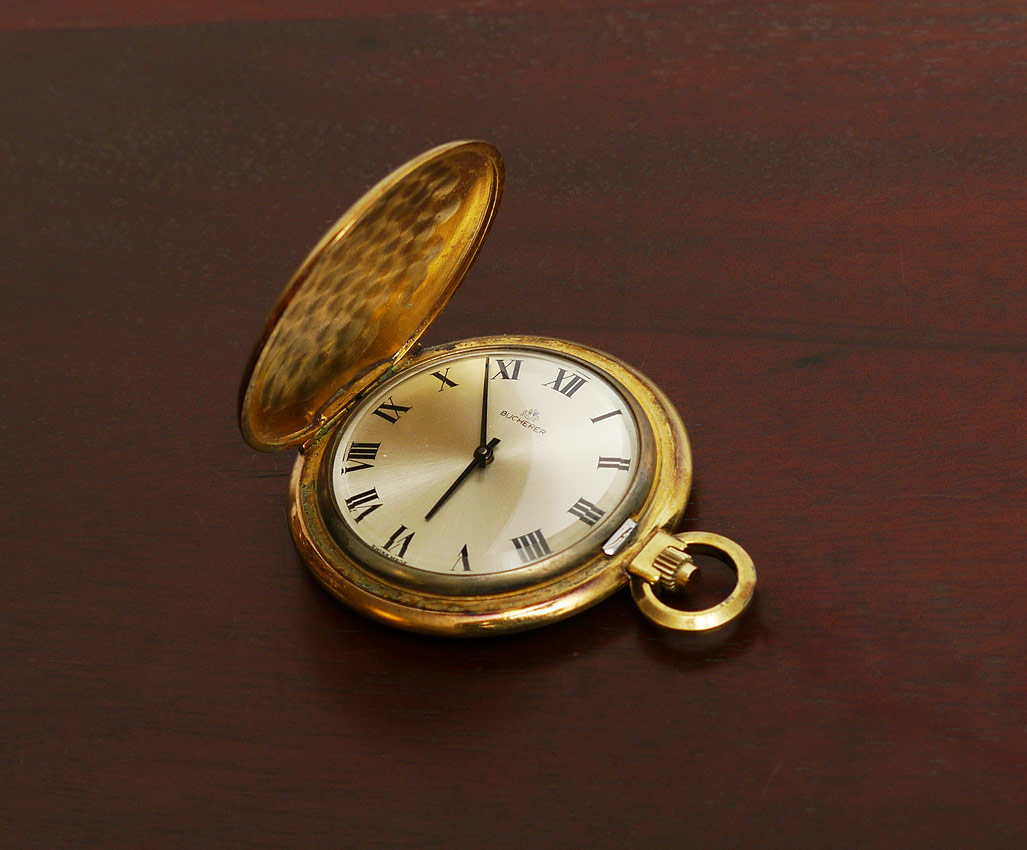 BUCHERER POCKET WATCH: Gold filled pocket watch, Dial with Roman numerals. Mechanical movement in working order may need servicing. Case measures 45 mm.