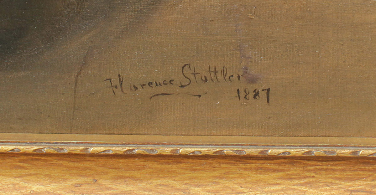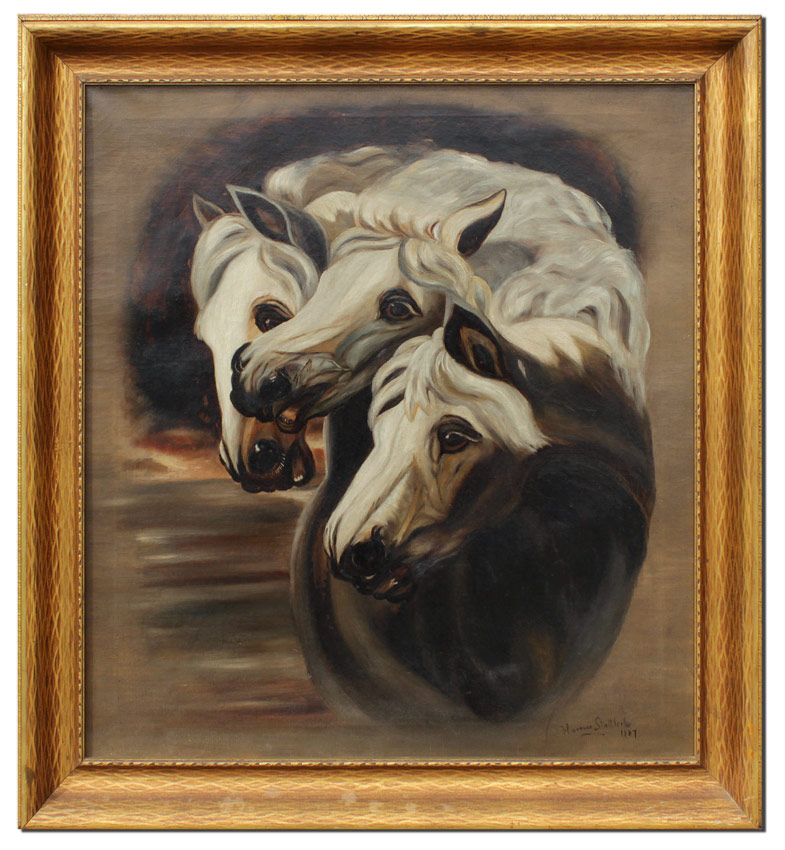 HERRING SR, John F., after, (British, 1795-1865): ''Pharaoh's Horses'', Oil/Canvas, 30'' x 28 1/4'', painting signed Florence Stuttler and dated 1887, a circular composition of three white, charging Arabian horses, is based on an 1848 painting by British sporting and animal painter John Fredrick Herring Sr., encased in a carved and gilded frame 35 1/2'' x 33 3/4''. The original ''Pharaoh's Horses'', one of Herring's most popular images, auctioned at Christie's in London for $445,500 in 1986.