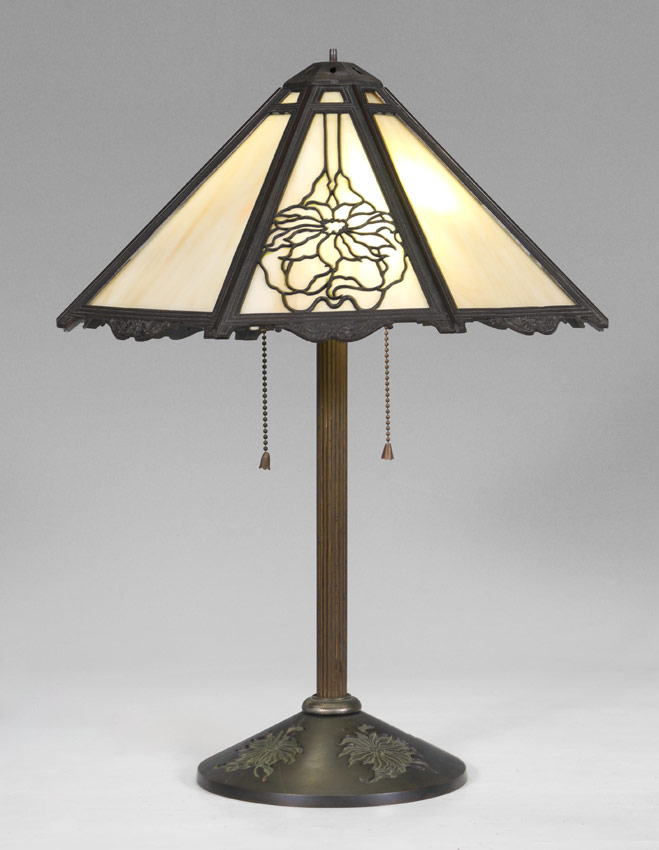 BRADLEY & HUBBARD POINSETTIA TABLE LAMP: Patinated cast metal base with poinsettia flower design, marked with Bradley & Hubbard mark, #261. 2 socket fixture. 21 3/4'' h. x 7 5/8'' dia. 8 panel caramel slag glass shade with filigree flower motif on alternating panels. 8'' h. x 15 3/4''.