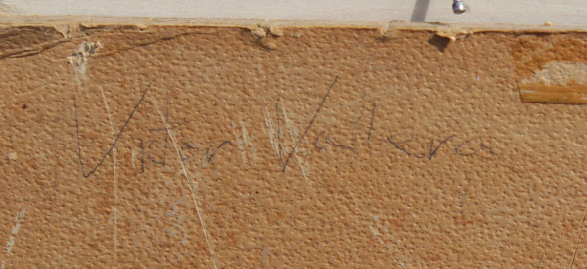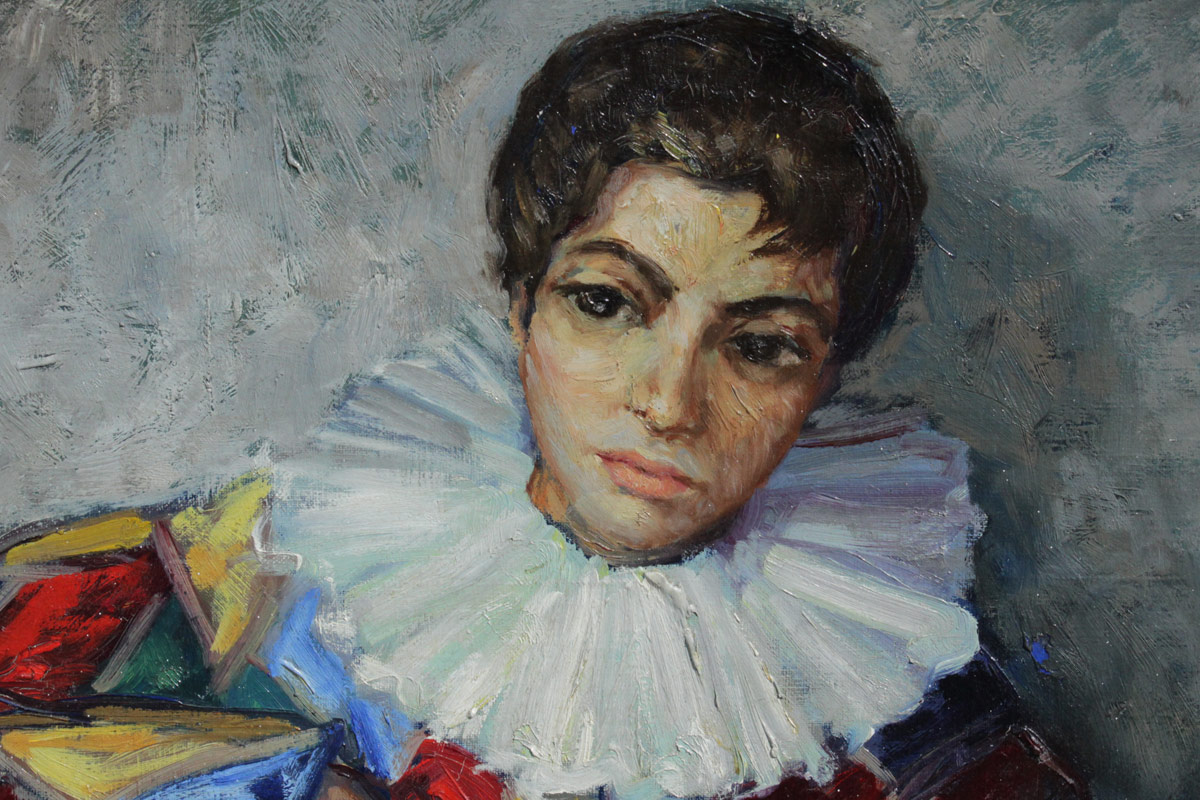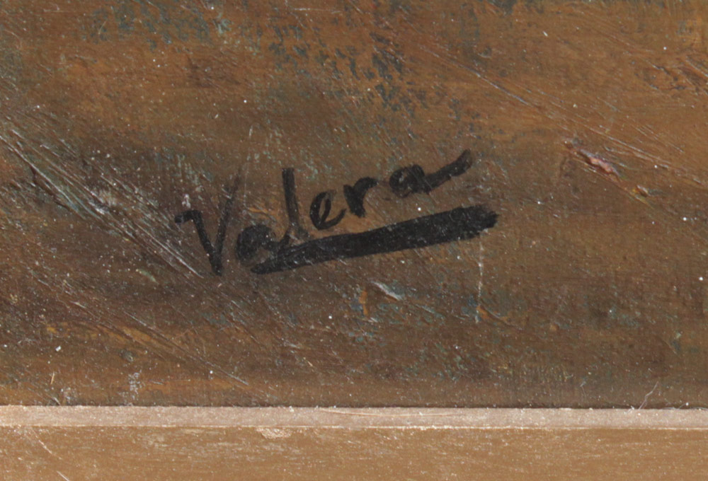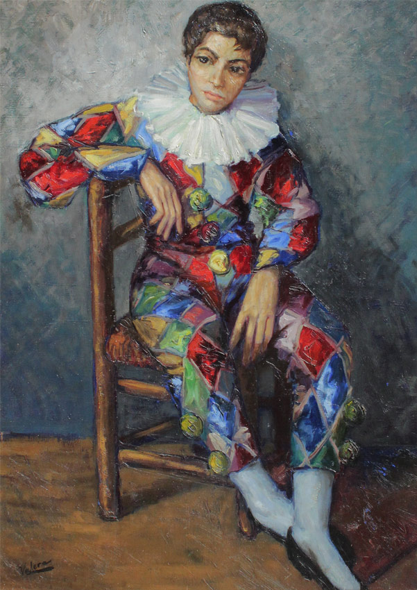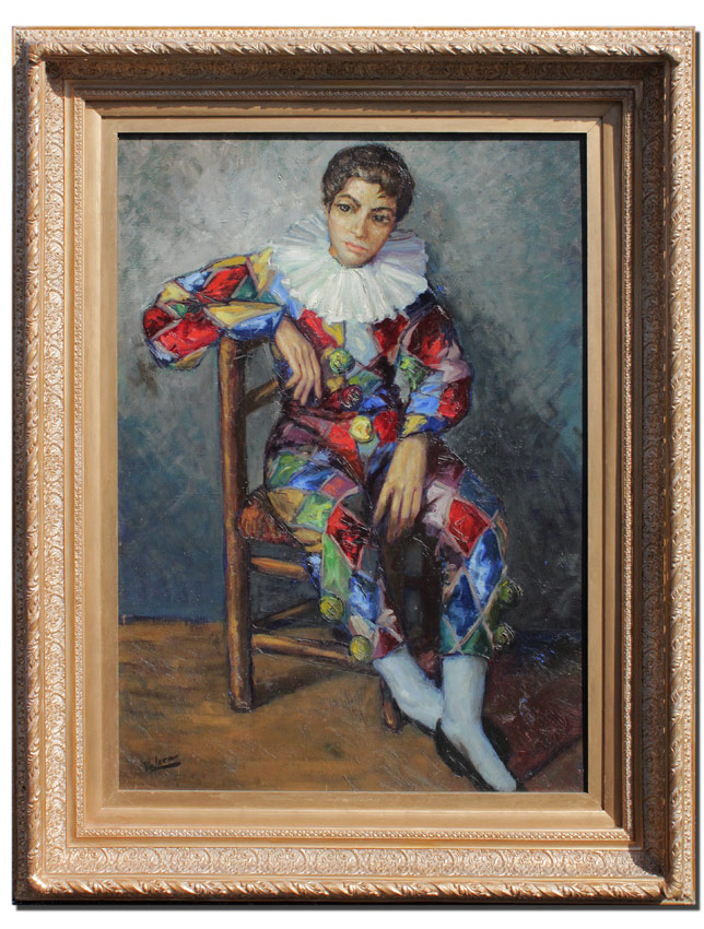 VERY GOOD PAINTING OF A HARLEQUIN SIGNED VALERA: Oil/Board, 39 1/2'' x 29'', signed lower left, encased in carved and gilded frame with wear 49'' x 39 1/4''.