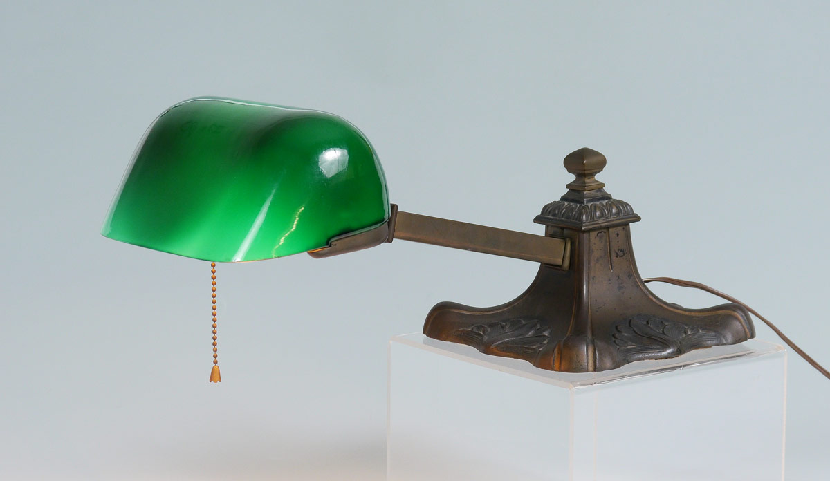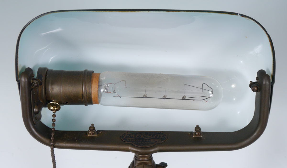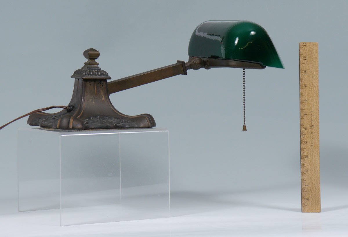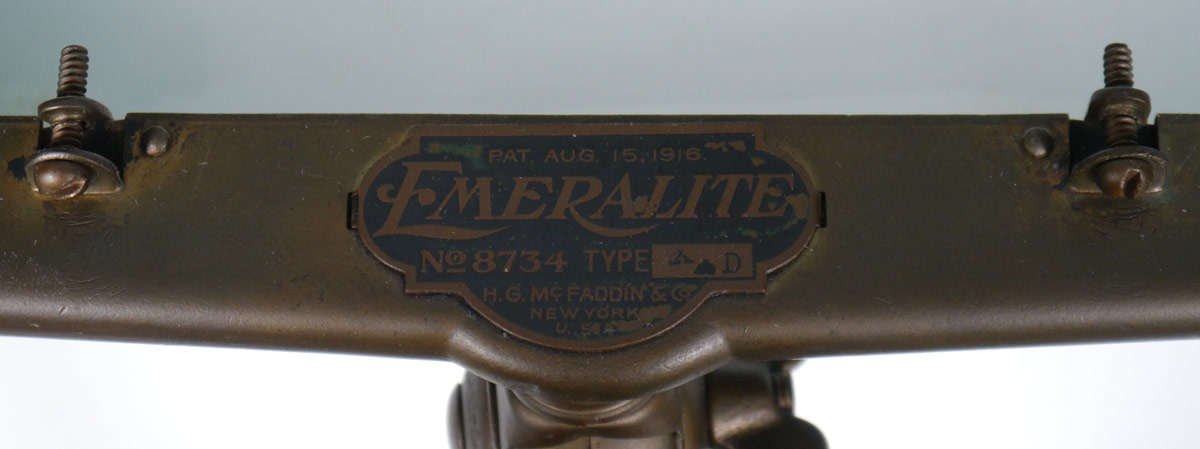 SIGNED EMERALITE PIANO LAMP: Sometimes referred to as a roll-top desk lamp as well. Heavy cast metal base with foliate designs, original Emeralite green glass shade number 8734. Measures 7 3/4'' h. x 17 1/2'' x 8 1/4''.