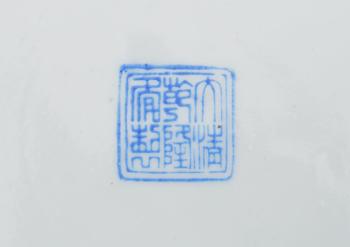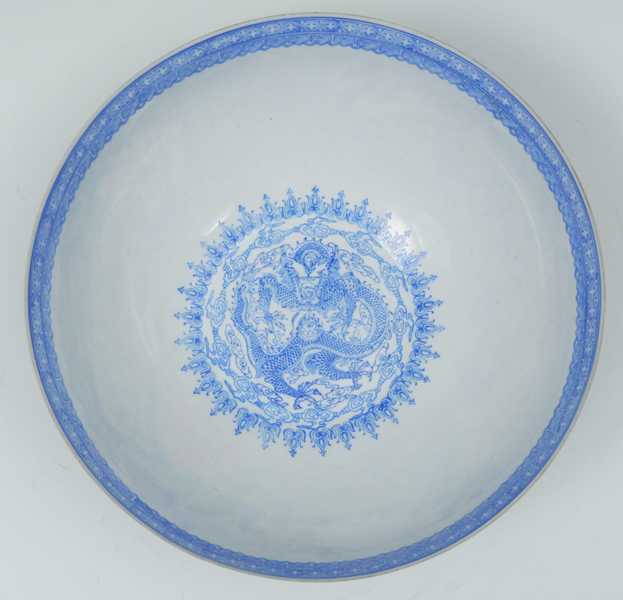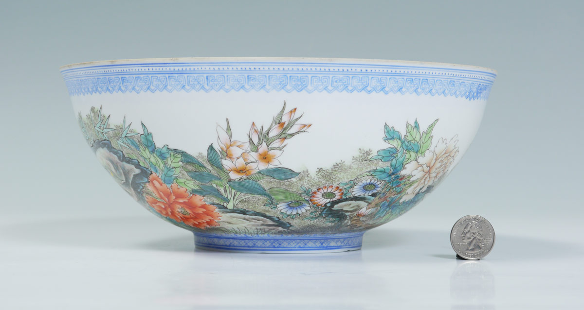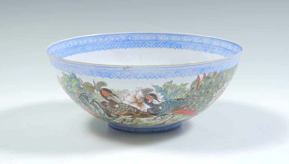 CHINESE EGGSHELL PORCELAIN BOWL IN BOX: Exterior paint decorated with peacock, foliate and flora decoration. Interior with blue decorated dragon motif and geometric rim. Spurious Qianlong dynasty mark on base. 4'' h. x 10''. Sold with presentation box.