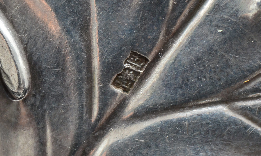 JAPANESE MEIJI PERIOD STERLING SALT: Body with detailed blades of grass with butterfly, dragonfly and locust, on leaf base with Meiji period sterling mark. Measures 1 1/4'' x 2''.