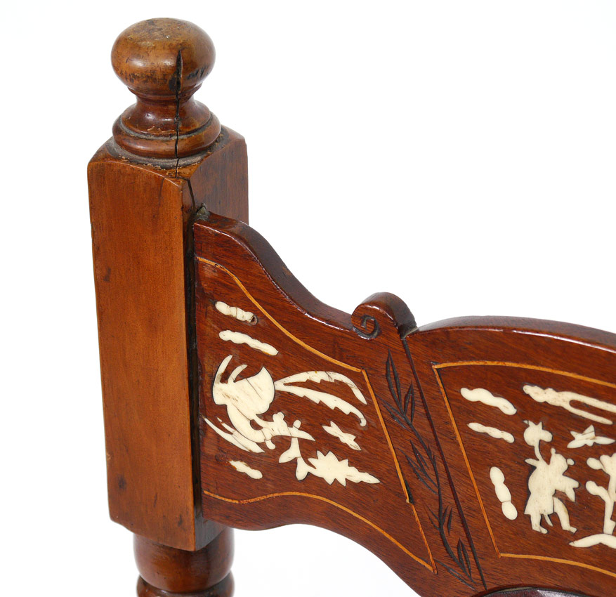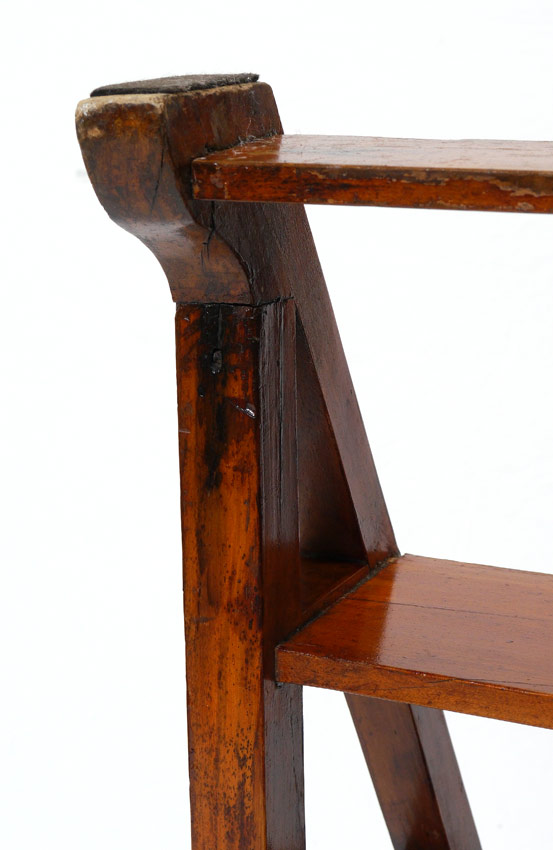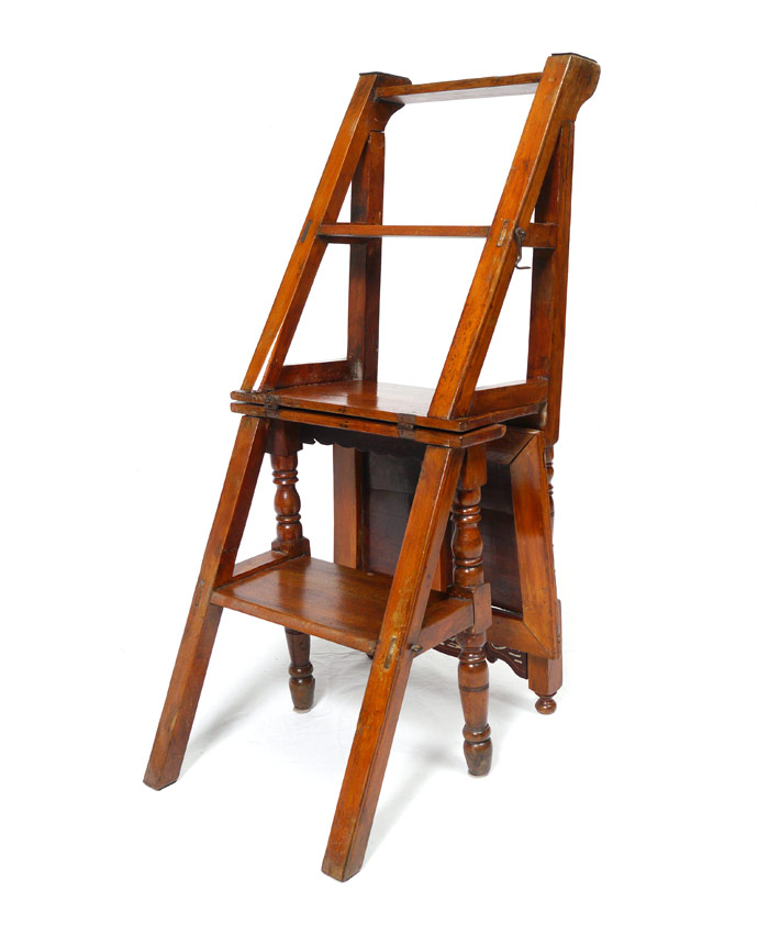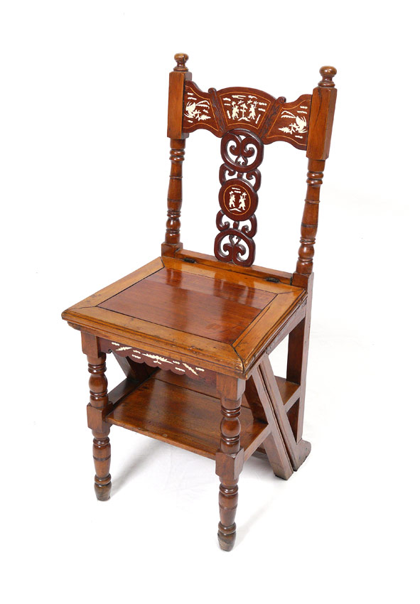19th C CHINESE BONE INLAY LIBRARY LADDER CHAIR: Made for the English market, easily converts from a chair to library ladder. Back of chair with inlaid bone figures, carved and openwork back splat, turned supports. Turned front legs. 37 1/4'' x 16 1/2'' x 19''.