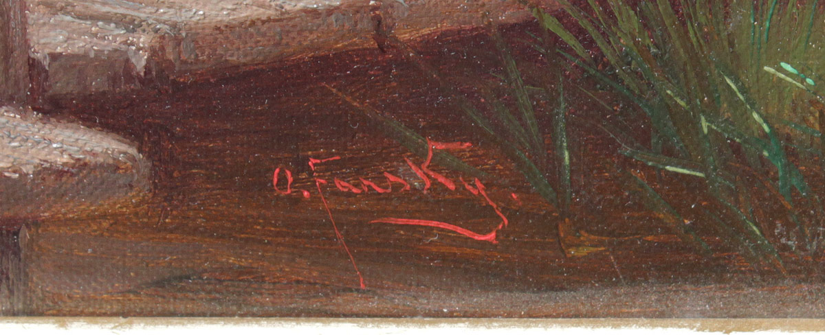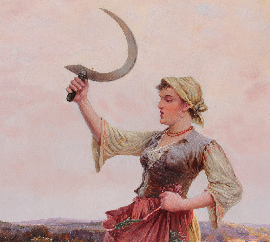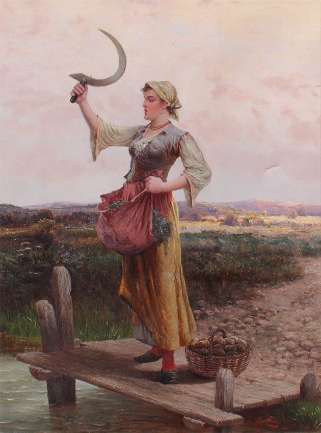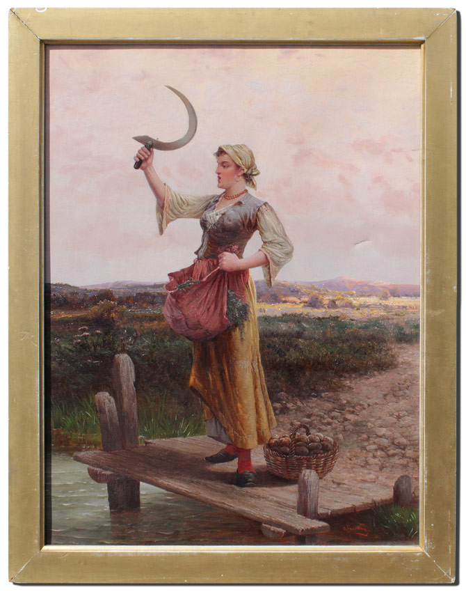 FARSKY, Oldrich, (American, 1860-1930): Peasant Girl Standing by the Water's Edge with Scythe Raised in the Air, Oil/Canvas, 17'' x 13'', signed lower right, original gilded liner with wear 19'' x 15''.